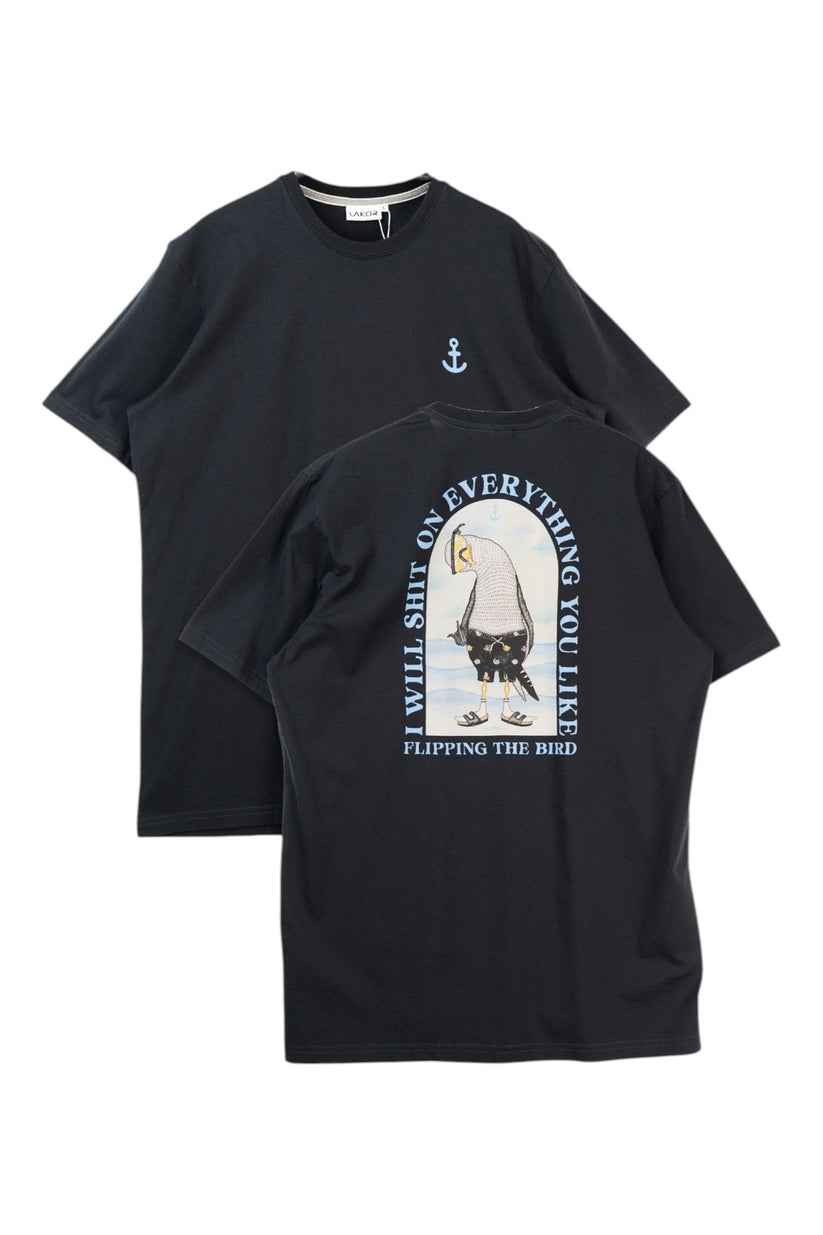 Denne sorte T-shirt kombinerer et enkelt frontudtryk med et markant statement-print på ryggen. Det store grafiske motiv med teksten “I will shit on everything you like – Flipping the bird” giver et humoristisk og provokerende twist, der skiller sig ud og tilfører masser af attitude.