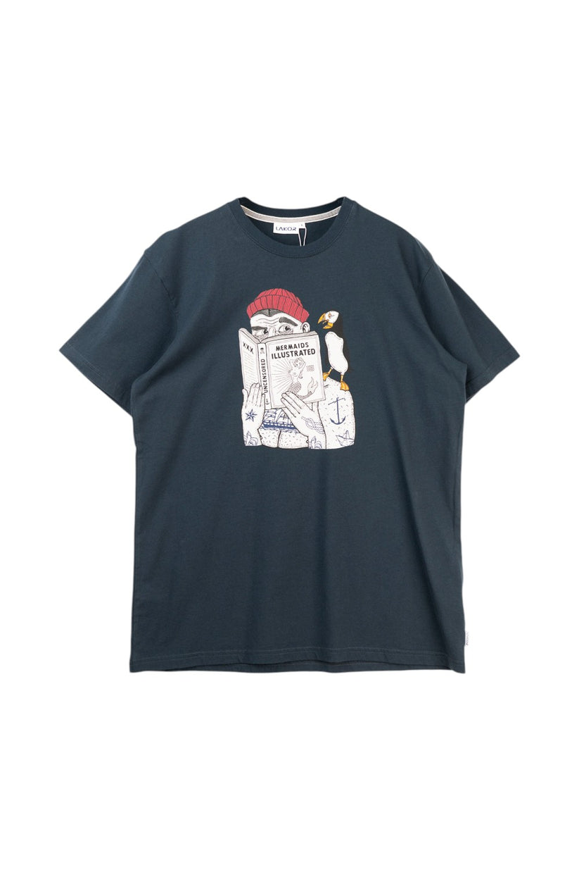 Denne mørkeblå T-shirt kombinerer et klassisk snit med et humoristisk og maritimt inspireret frontprint. Motivet viser en sømand med rød hue, der læser “Mermaids Illustrated”, flankeret af en måge – et legende design med fine detaljer, der giver T-shirten masser af personlighed.