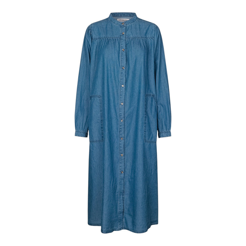 JessLL-kjolen er lavet af let denim i tætvævet, blød bomuldskvalitet, der sikrer et elegant og behageligt look. En alsidig must-have-kjole, der kan styles afslappet med sneakers eller elegant med hæle.