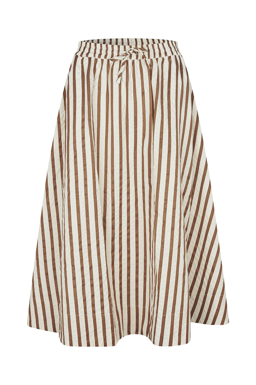 Denne stribede nederdel har et let og afslappet udtryk, der passer perfekt til forår og sommer. De lodrette striber giver et elegant og forlængende look, mens den lange, let svajende silhuet skaber et smukt og naturligt fald. Taljen er elastisk og justerbar med bindebånd, hvilket sikrer en behagelig pasform og gør nederdelen nem at tilpasse.