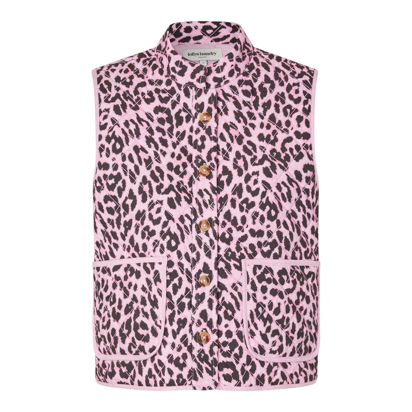 Denne quiltede vest i lyserødt leopardprint er et statement-piece, der tilfører personlighed og kant til garderoben. Det lette design gør den ideel som et ekstra lag over skjorter, strik eller kjoler, når du ønsker varme uden at gå på kompromis med stilen. Leopardprintet giver et moderne og legende udtryk, mens den klassiske vestesilhuet sikrer et tidløst look.