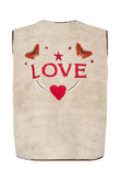 Denne vest fra Lollys Laundry er en legende og iøjnefaldende style, der kombinerer varme, komfort og personlighed. Den bløde teddy-kvalitet giver et hyggeligt udtryk, mens det broderede LOVE-motiv med hjerte, stjerner og sommerfugle på ryggen tilfører et kreativt og charmerende twist. Vesten er perfekt som lag-på-lag over skjorter, strik eller kjoler og fungerer både som praktisk varme og som et statement-piece i garderoben.