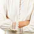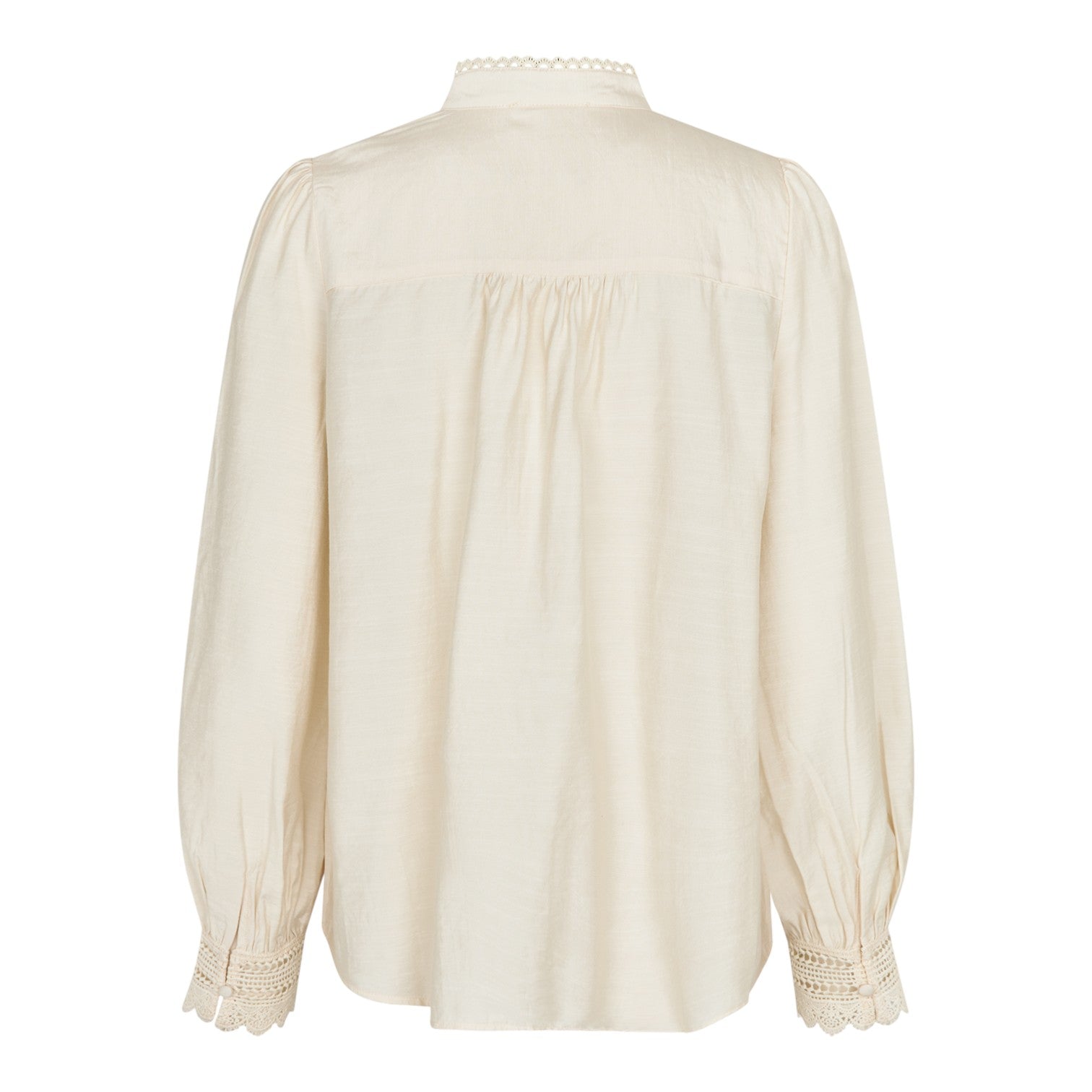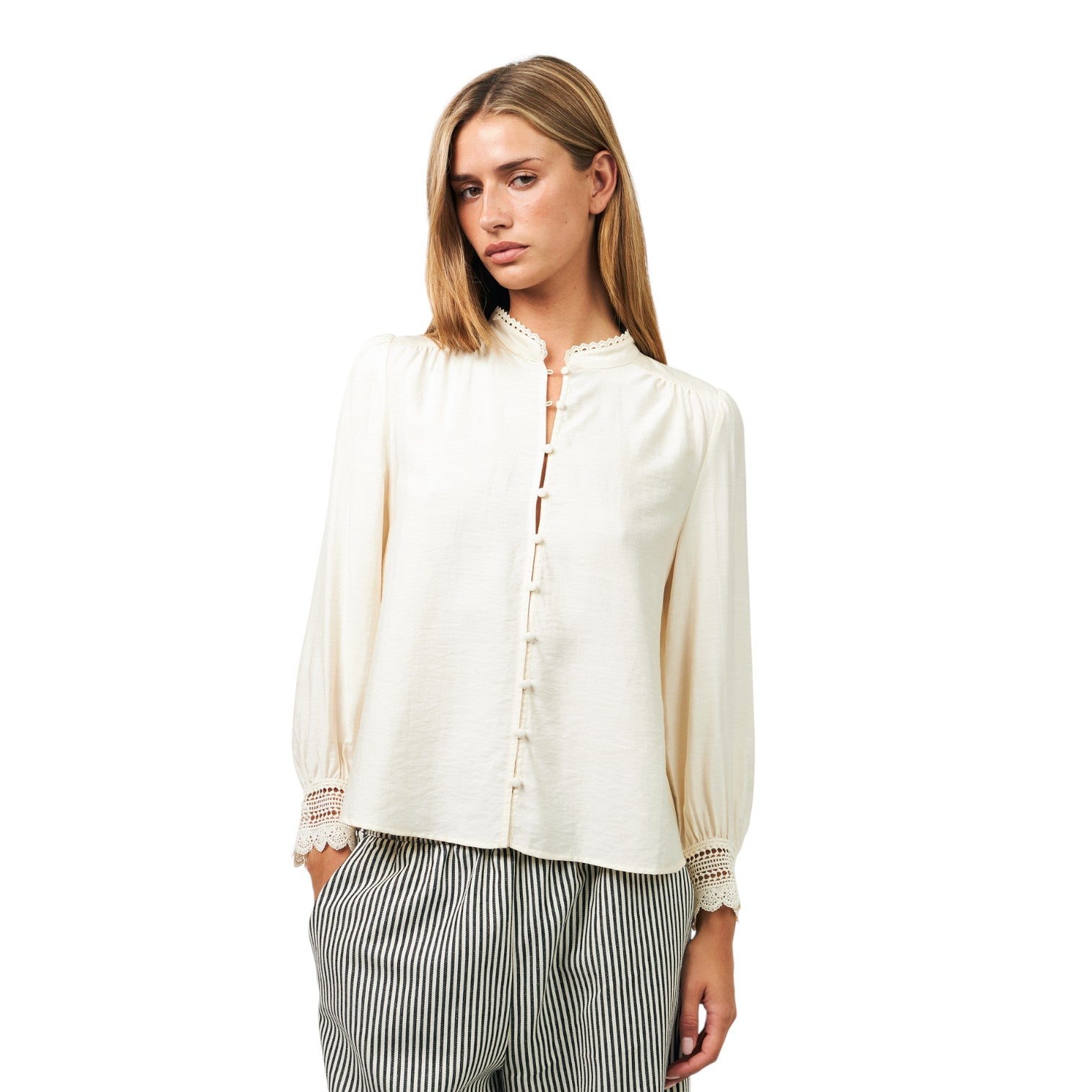 Denne elegante cremefarvede skjorte fra Lollys Laundry kombinerer klassisk femininitet med delikate detaljer. Skjorten har fine knapper foran, en høj hals med blonder og smukke manchetter med broderi, der giver et romantisk udtryk.