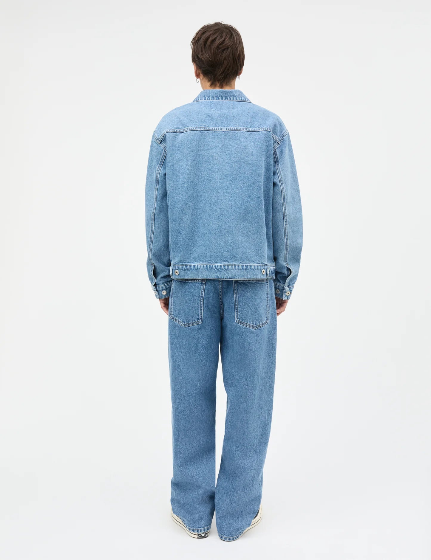 Denimjakke med lige pasform og klassisk krave i et vasket finish. Jakken har to brystlommer med flap, lodrette stiklommer og gennemgående knaplukning. Ærmerne afsluttes med manchetter, og ryggen er holdt enkel med markerede sømlinjer.