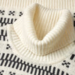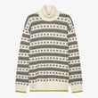 Denne klassiske rullekravesweater kombinerer nordisk mønstertradition med et moderne twist. Den er strikket i en blød og varm uldblanding, der giver både komfort og åndbarhed – perfekt til kolde dage. Sweateren har et elegant sort-hvidt mønster, som skaber et tidløst udtryk, mens den grønne kontrastkant forneden tilføjer et frisk og uventet detaljepunkt.