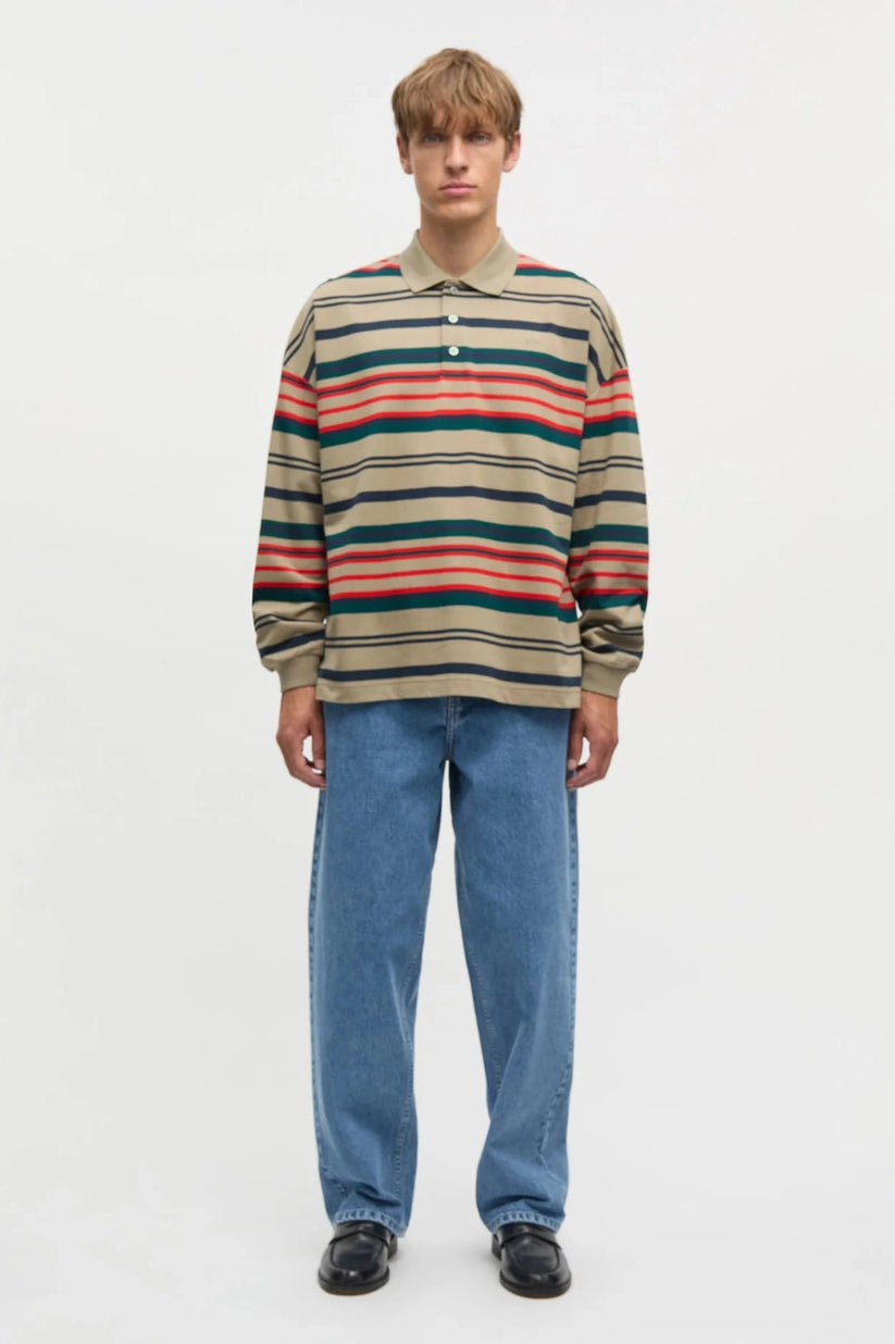 Langærmet polo i et lige snit med krave og knaplukning. Designet har et flerfarvet stribemønster i horisontale baner, der varierer i bredde. Ærmerne afsluttes med ribkanter, mens kroppen har en glat kant for et enkelt udtryk.