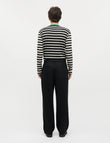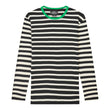 Denne langærmede T-shirt fra Mads Nørgaard er en moderne fortolkning af den klassiske sømandstrøje. De sorte og hvide striber giver et tidløst udtryk, mens den grønne kant i halsudskæringen tilfører et frisk og iøjnefaldende twist. Det gør trøjen både afslappet og stilfuld på samme tid.
