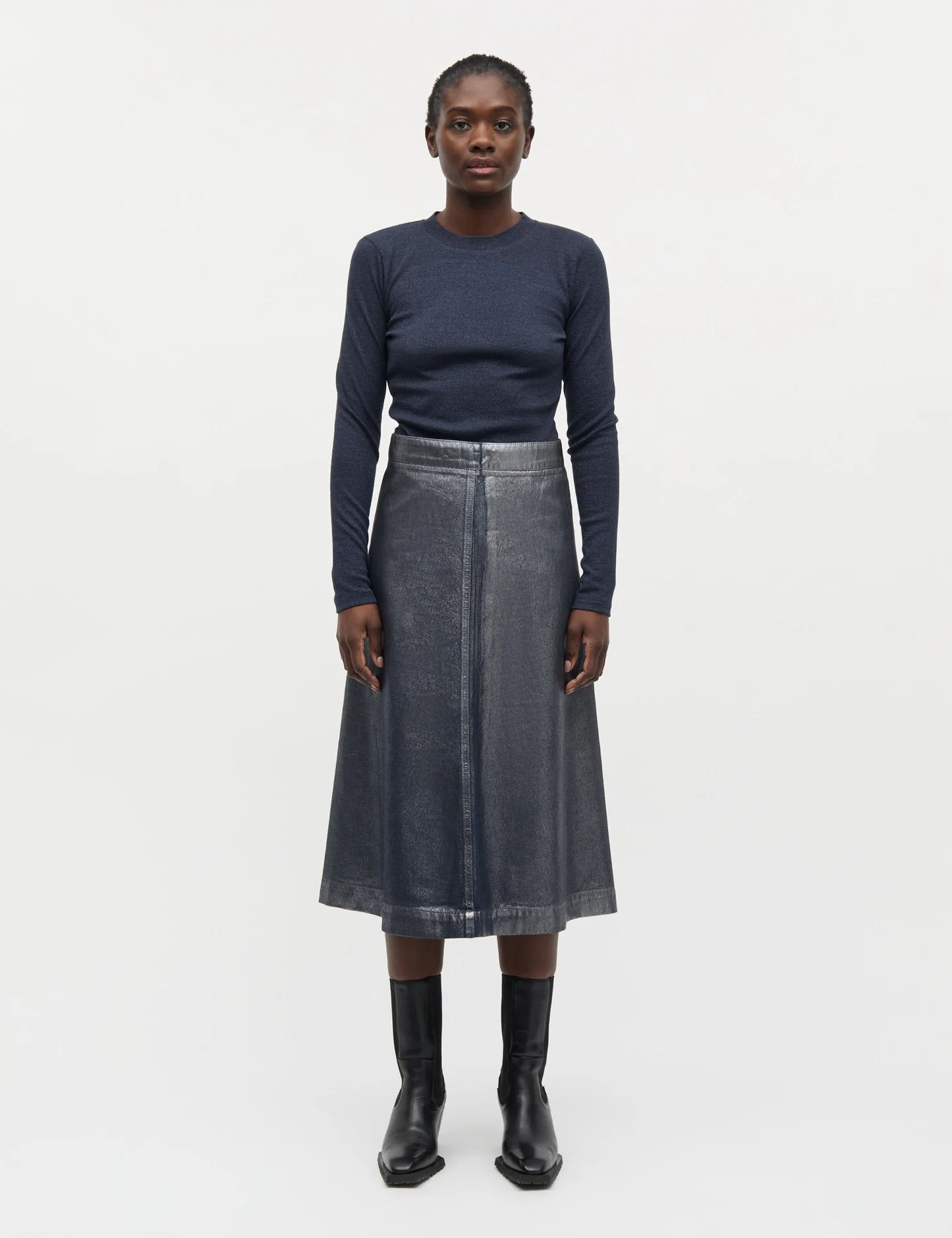 Denne langærmede bluse fra Mads Nørgaard forener enkelthed med et elegant twist. Den mørkeblå farve har en diskret glimmer-effekt, som giver et sofistikeret udtryk, uden at gå på kompromis med det minimalistiske design. Den er perfekt til både hverdag og mere festlige lejligheder, hvor du ønsker et rent, men eksklusivt look.