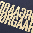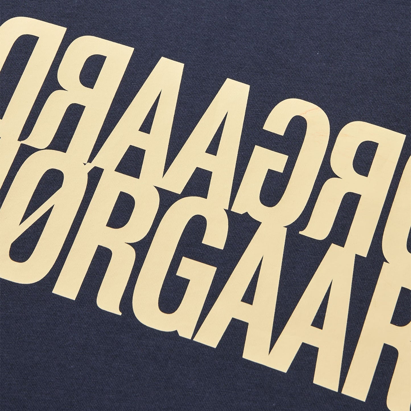 Let T-shirt med korte ærmer, rund hals og stort, delvist spejlvendt logoprint på brystet.