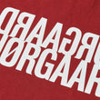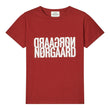 Let T-shirt med korte ærmer, rund hals og stort, delvist spejlvendt logoprint på brystet.