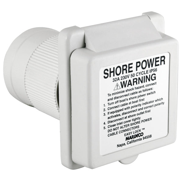 Marinco landstrømsindtag i glasfiber/polyester med ”Easy Lock System” der er vandtæt.