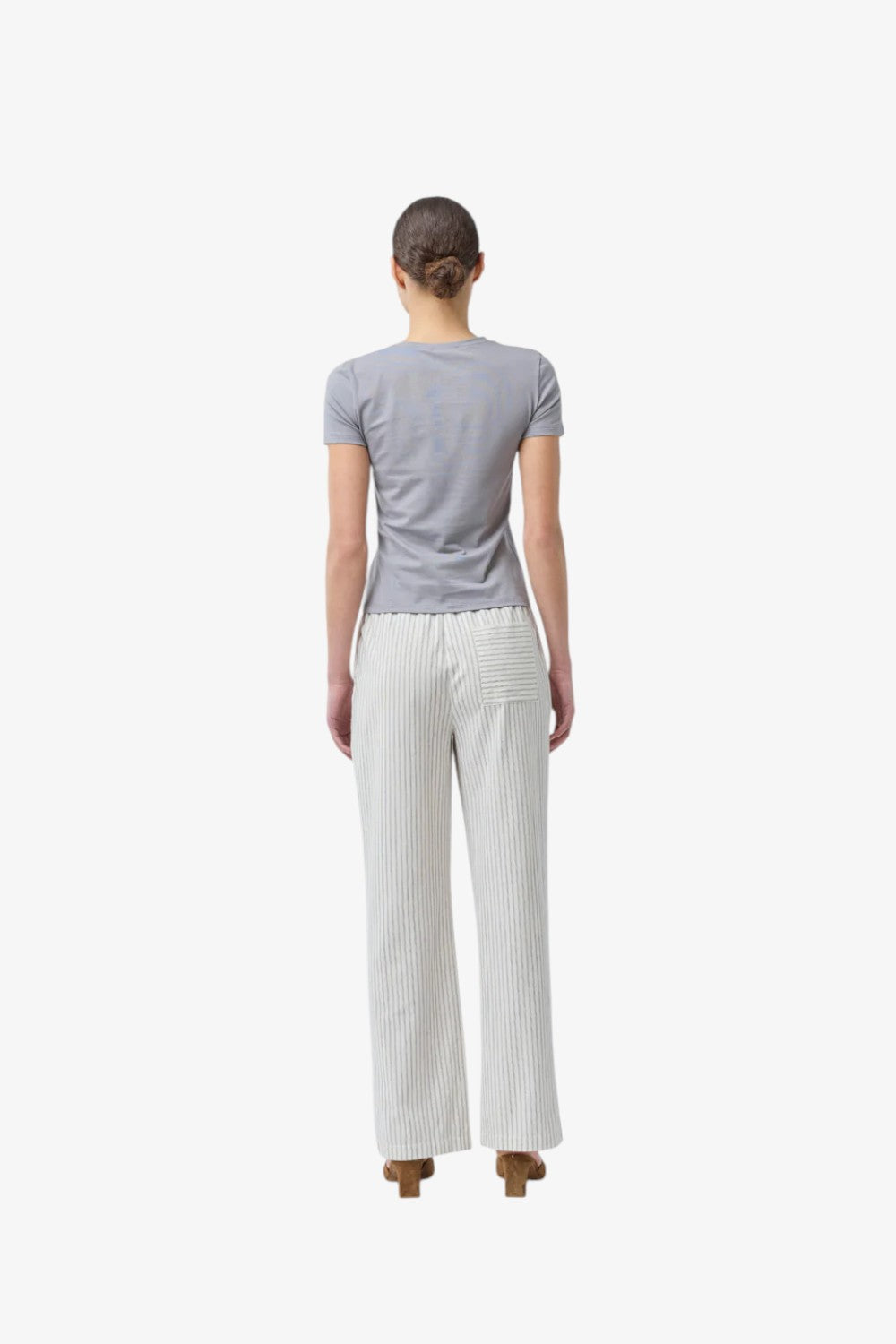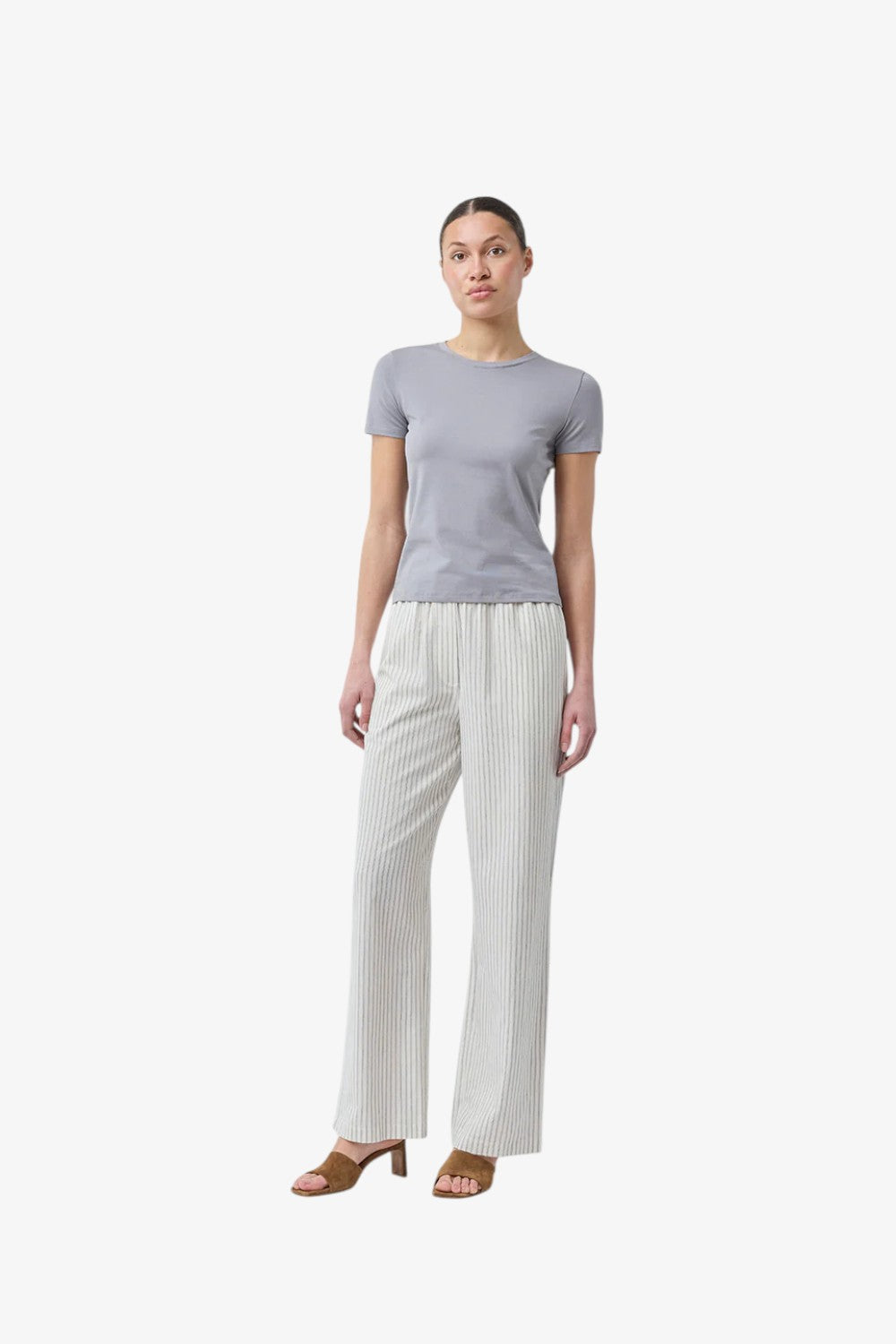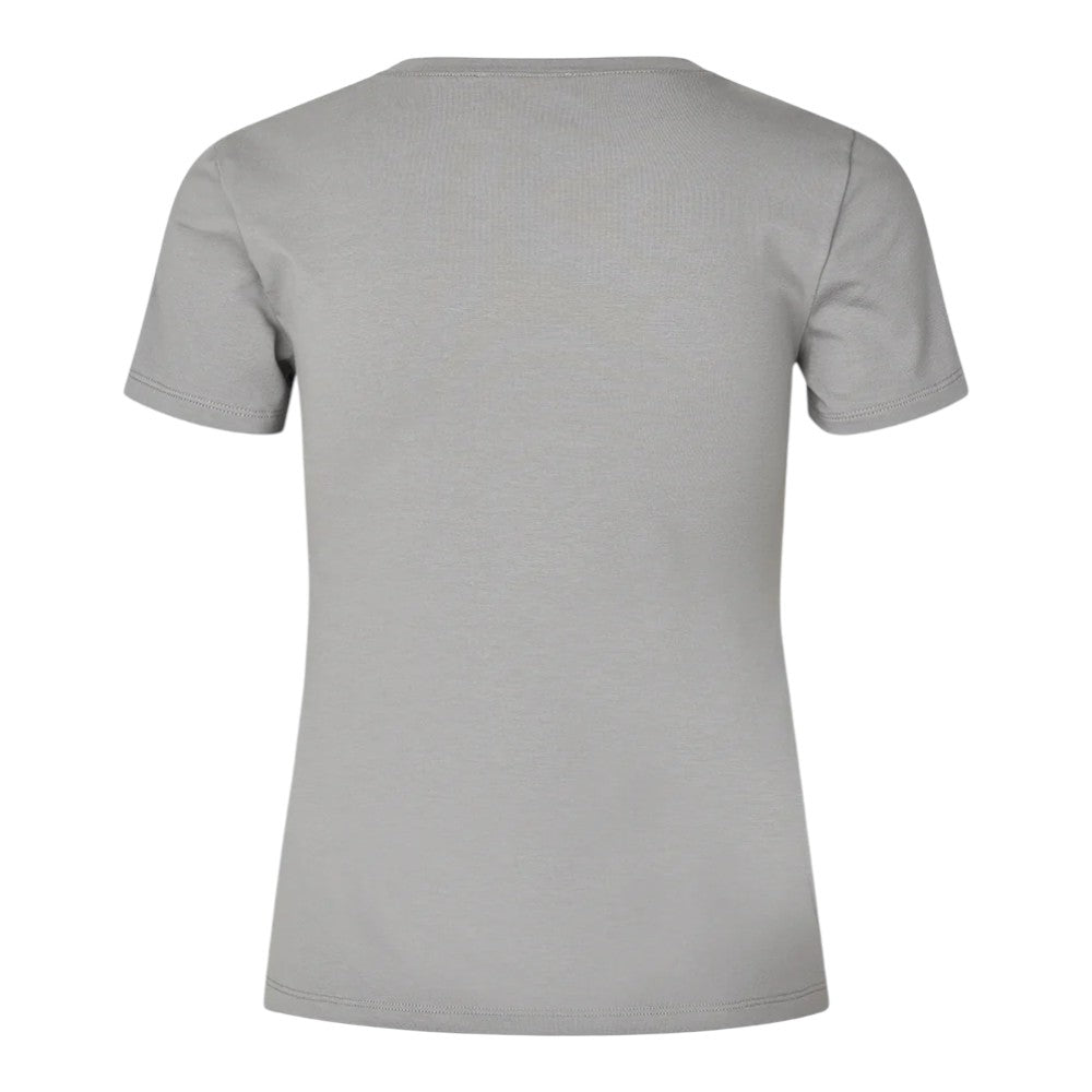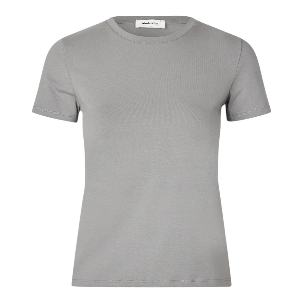 Tætsiddende basic t-shirt i grå med høj og lige udskæring i halsen. DaeMD t-shirt er fremstillet i økologisk bomuld. Modellen er 175 cm og har en størrelse S/36 på.