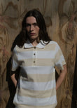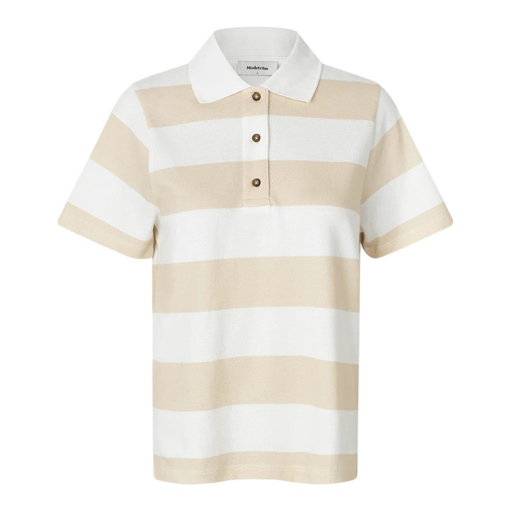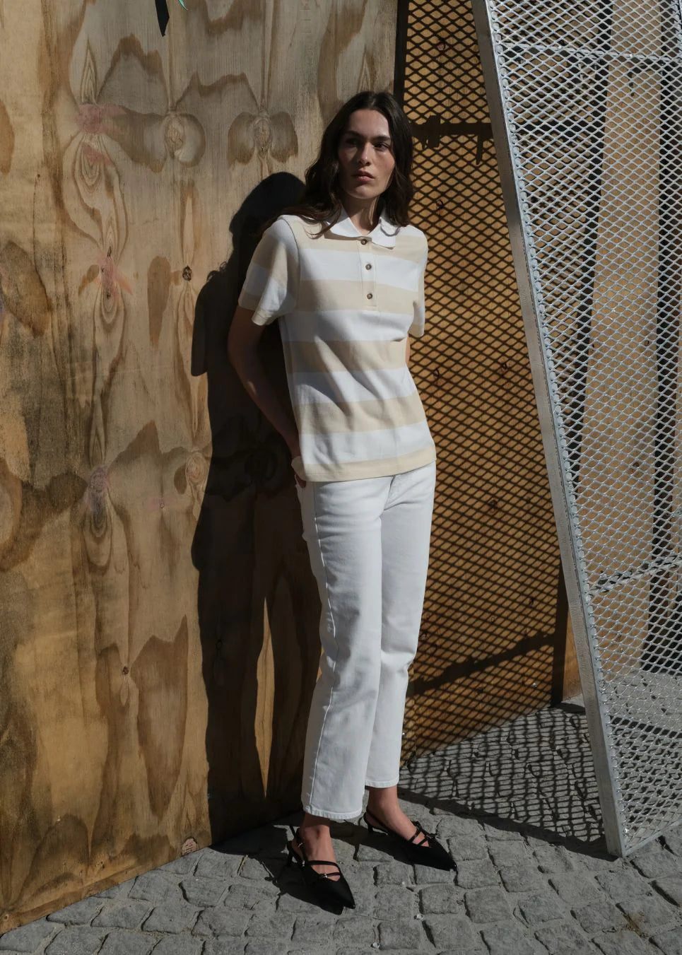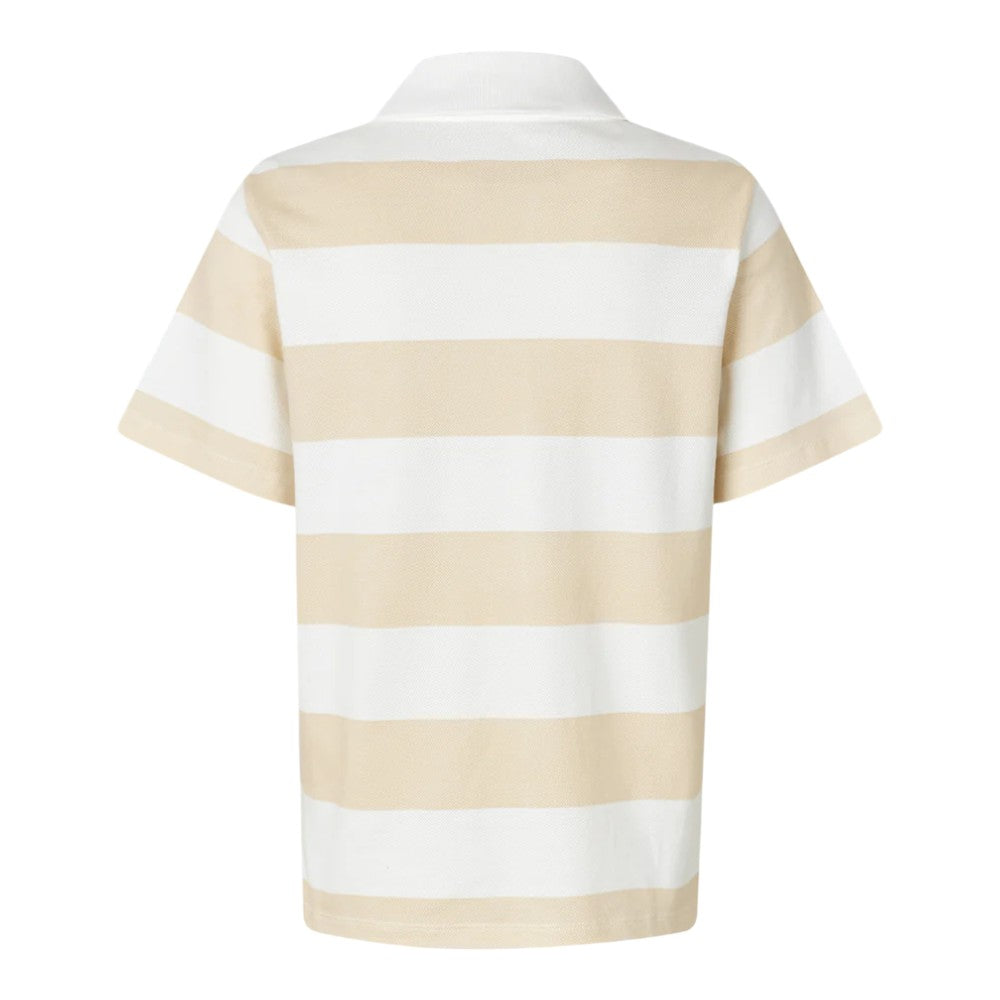 Kortærmet polo i hvid med beige striber i 100% bomulds pique og med et broderet logo. NobuMD LS polo har en stolpelukning med 3 knapper.