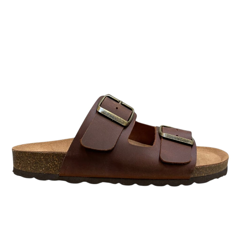 Sandal af læder til damer. Med 2 remme og kork mellemsål. Fås i flere farver.