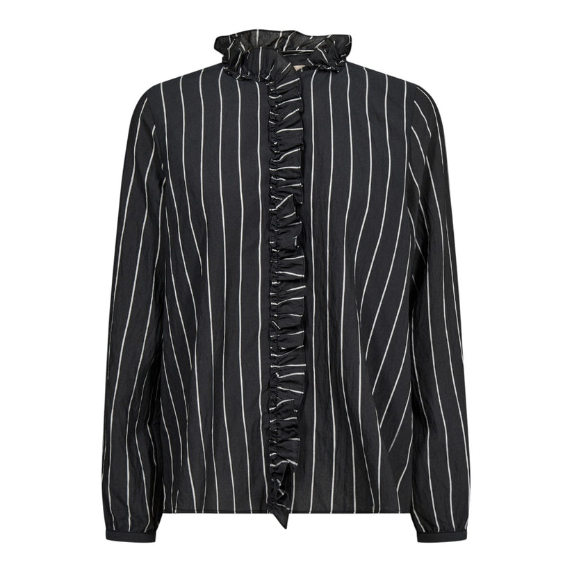 Denne elegante skjorte med striber kombinerer tidløs sofistikation med et feminint udtryk. Skjorten er skåret i en regular fit, der giver en flatterende pasform, og den skjulte knaplukning fremhæves af fine flæsedetaljer, som fortsætter op omkring halsudskæringen. Detaljerne tilfører et raffineret og moderne præg til den klassiske skjorte.