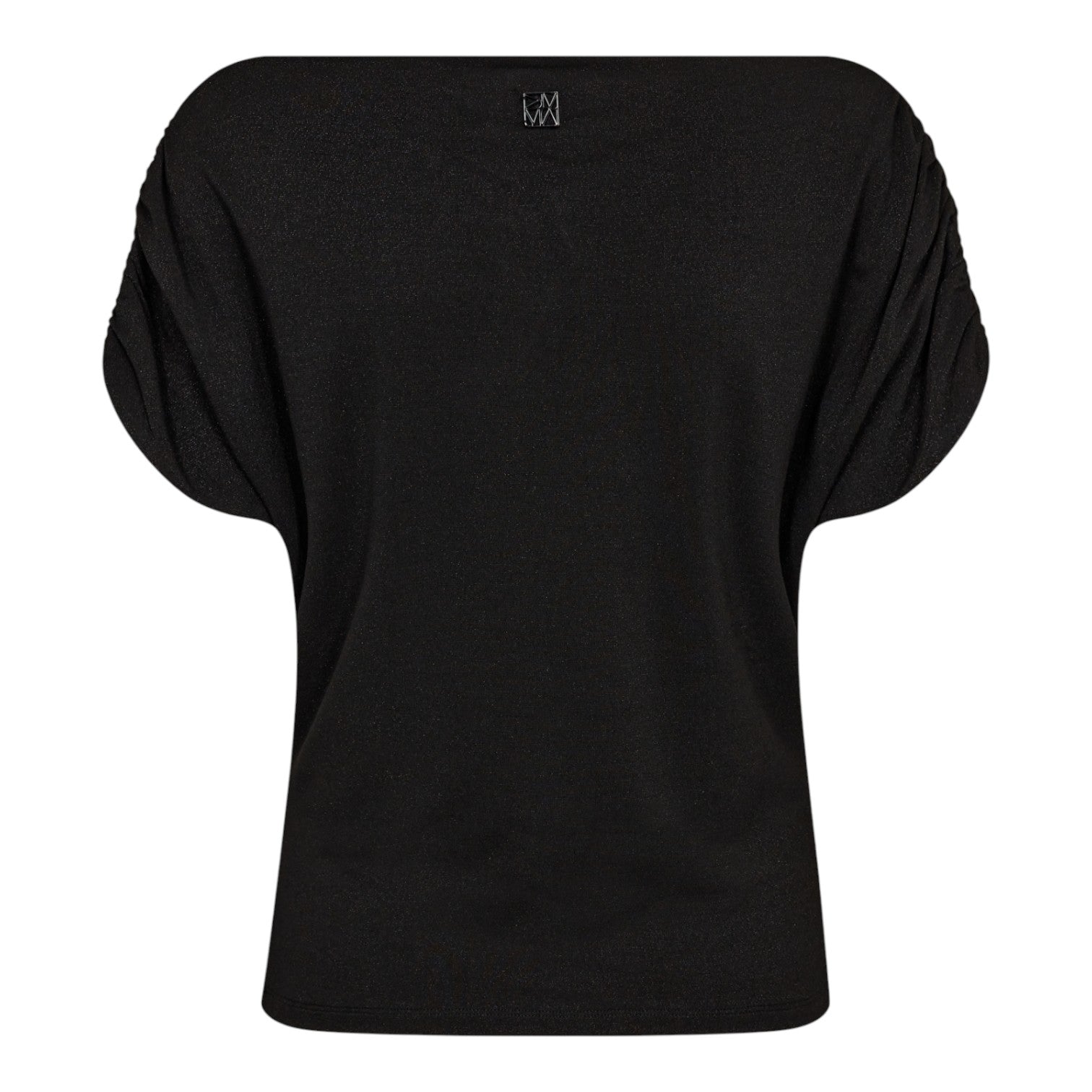 Elegant sort bluse fra Mos Mosh med et enkelt, men raffineret design. Blusen har en let skinnende overflade, der giver et eksklusivt udtryk, og de løse, korte ærmer tilføjer et afslappet, men feminint look.