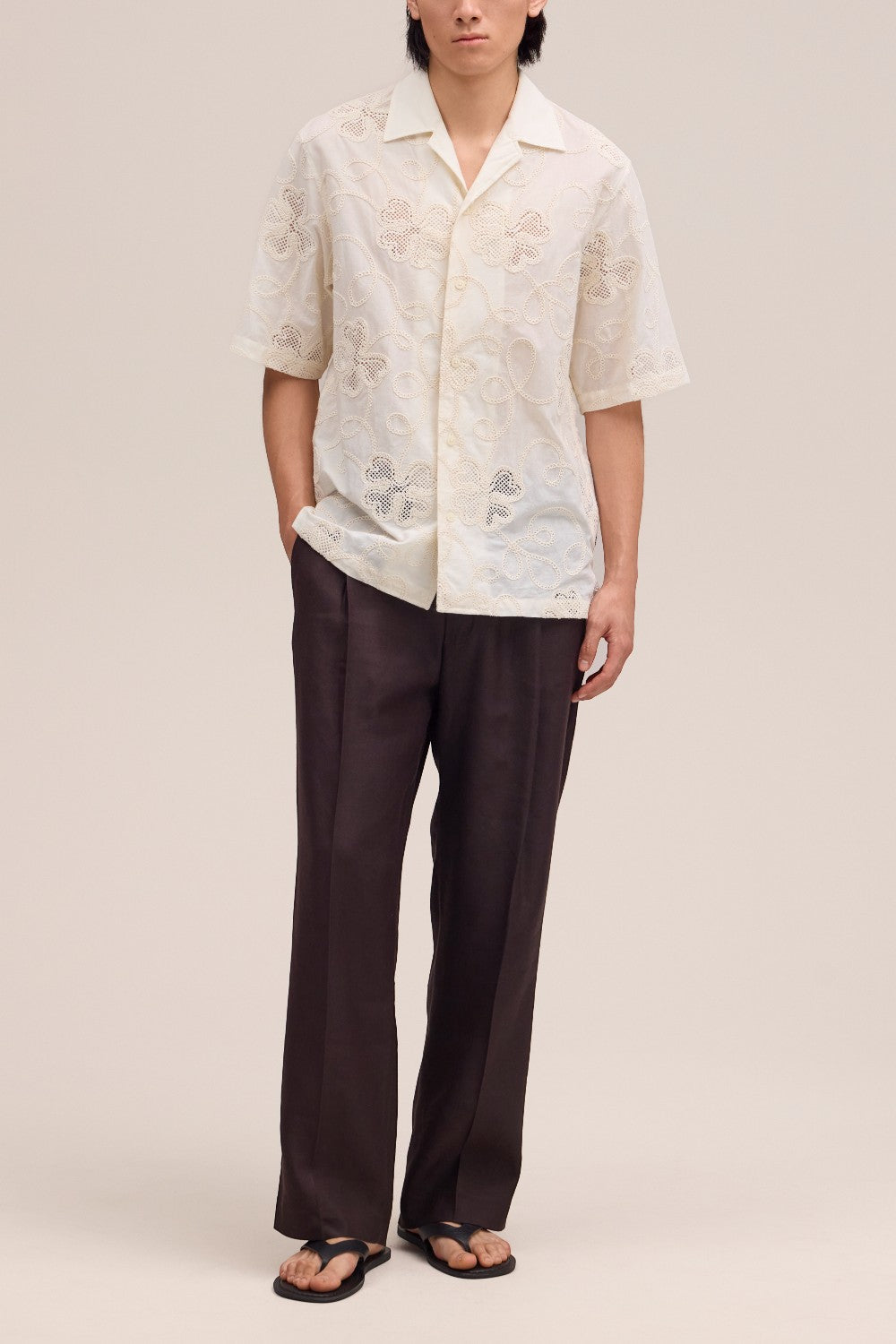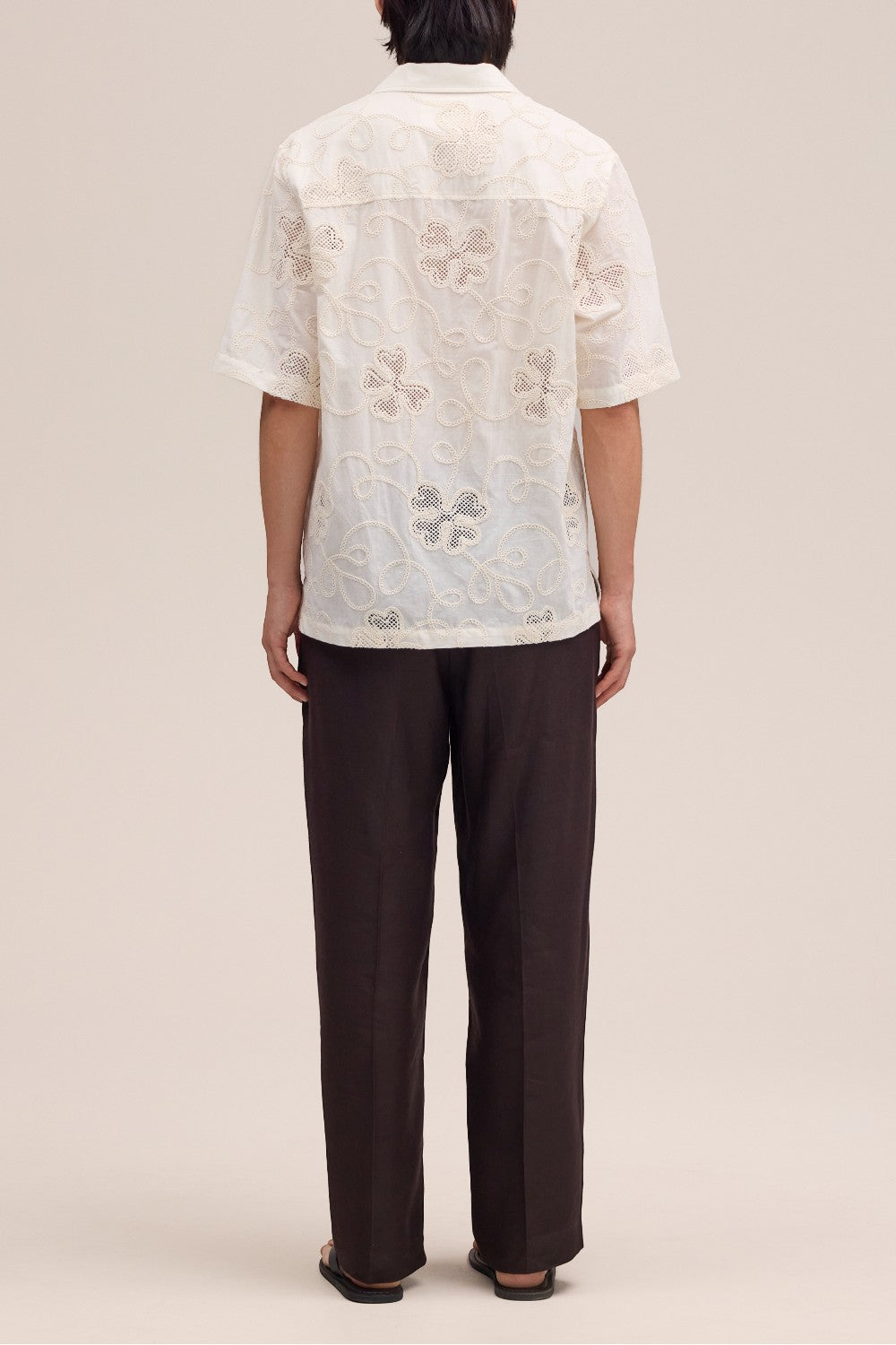 Det broderede cut-out mønster skaber en luftig og åben struktur, der tilfører skjorten karakter og et eksklusivt præg. Kombinationen af det klassiske snit og de fine detaljer gør den nem at style både til hverdagsbrug og mere afslappede anledninger.