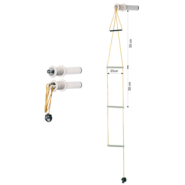 Består af 3 polypropylen trin og et rustfrit stålhåndtag monteret på Ø 3 mm polyesterline. Trinene er opbevaret i et polyamid rør med et gråt polypropylendæksel. Den evt. nødstedte fjerner låget, tager stigen ud og klatrer op ad stigen.