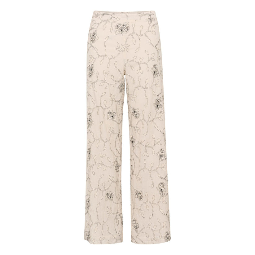 Disse elegante bukser fra Part Two er designet med et let, løstsiddende fit og smukke broderede blomsterdetaljer i sort. Bukserne har en bred benvidde og en behagelig talje, der sikrer komfort hele dagen. De broderede mønstre tilføjer et feminint og eksklusivt udtryk, som gør bukserne perfekte til både hverdagsbrug og mere festlige lejligheder.