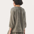 Skjorten har en flatterende V-hals, en elegant rynket krave, der giver et feminint touch, og trekvartlange ærmer, der er perfekte til overgangsvejr.