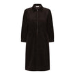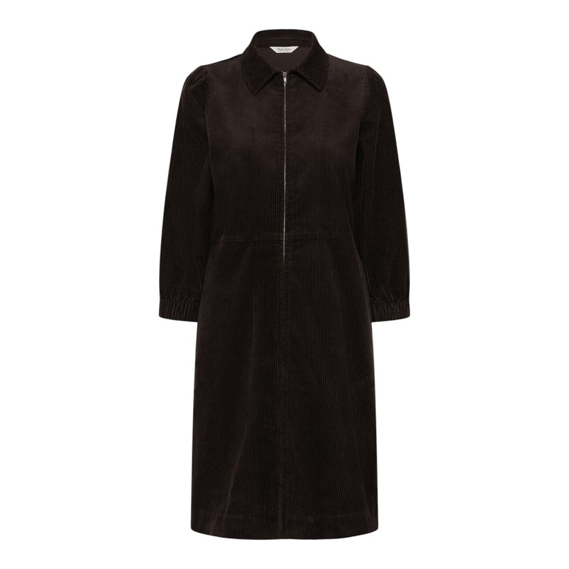 En tidløs fløjlfavorit til efteråret og vinteren. Kjolen er syet i blød, bredriflet fløjl, som giver et varmt og eksklusivt udtryk. Den rene skjortekrave og lynlåslukningen foran gør den nem at style – brug den lukket for et pænt look eller åben med en rullekrave under.