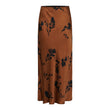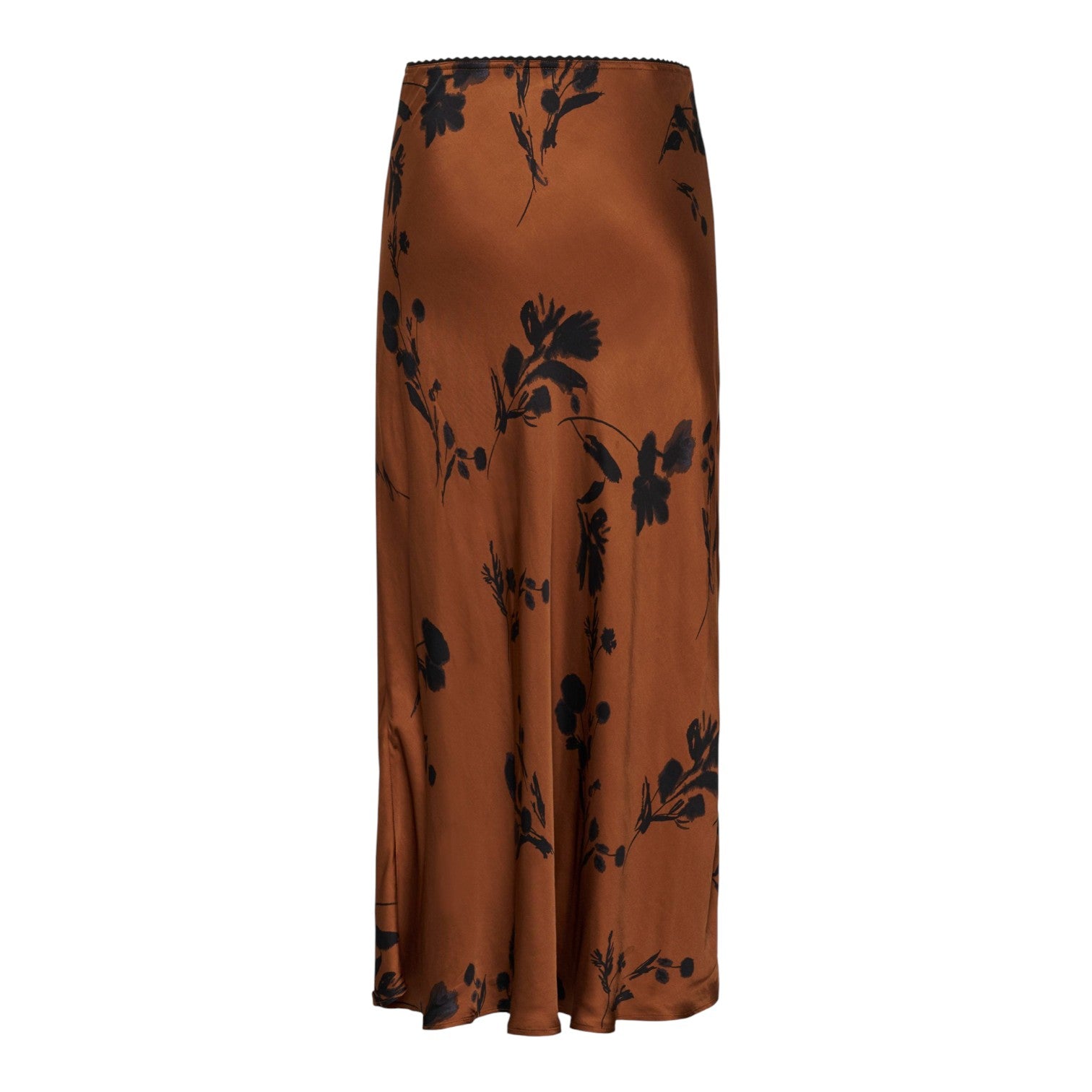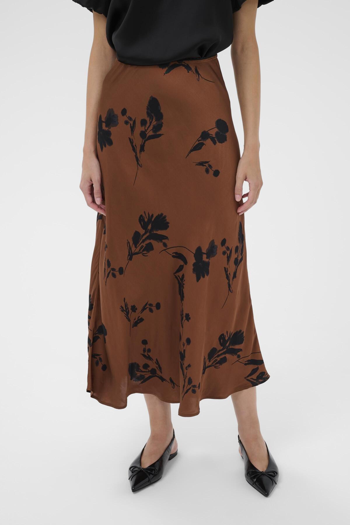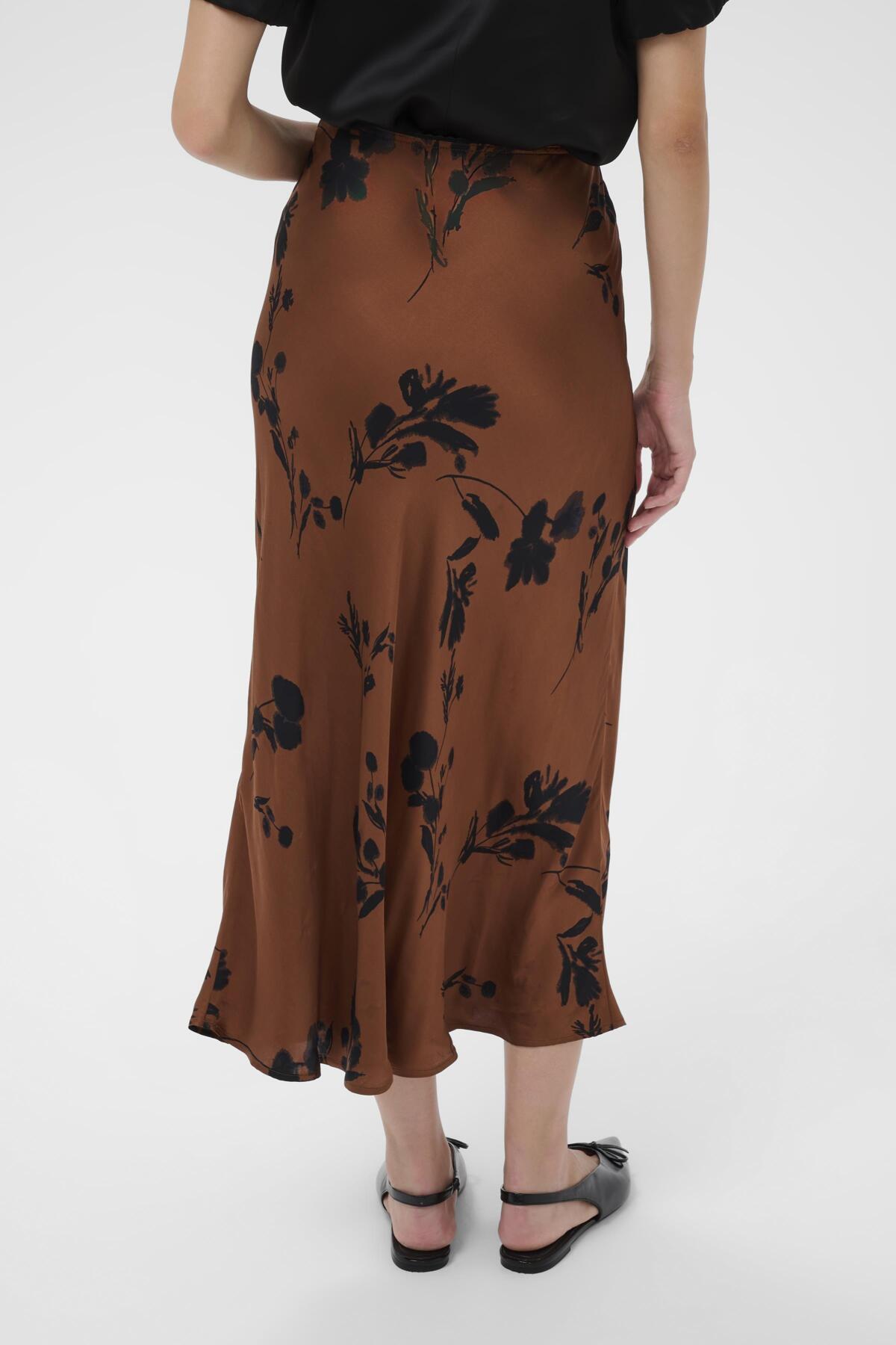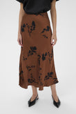 Denne elegante midi-nederdel forener et feminint udtryk med en behagelig pasform. Nederdelen har en smuk brun bundfarve med et mørkt blomsterprint, der giver et naturligt og tidløst look.