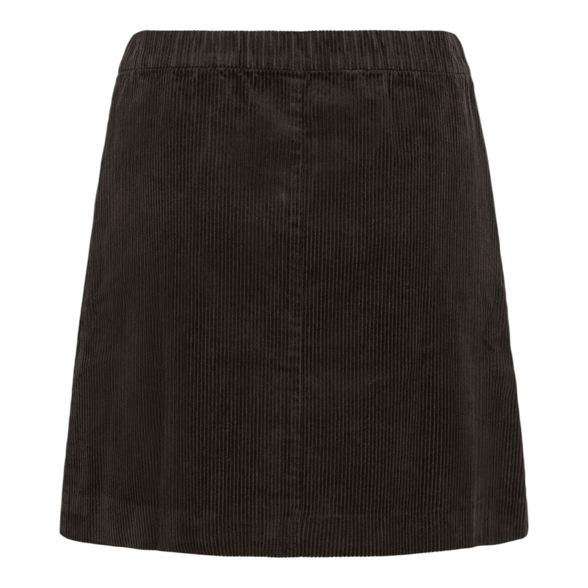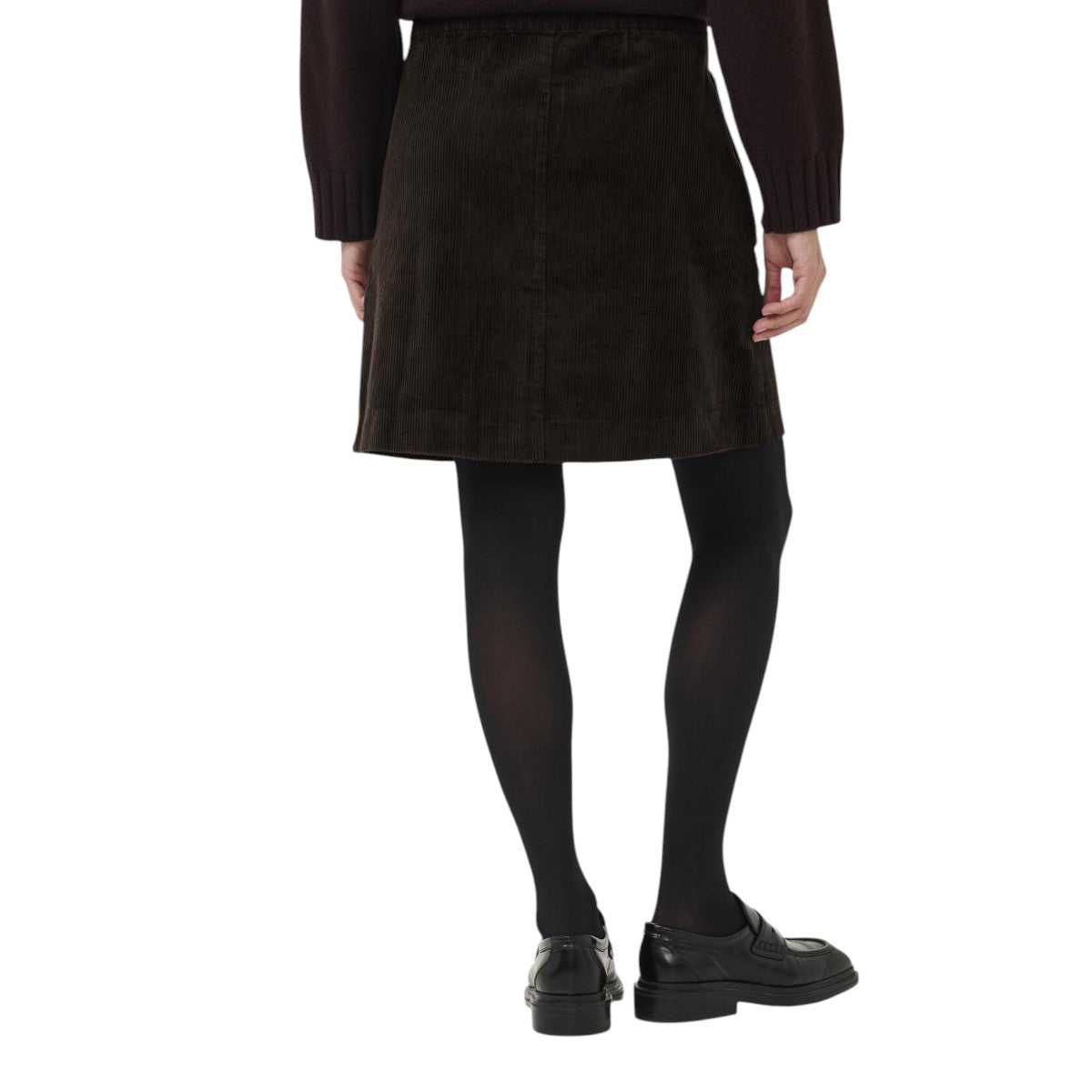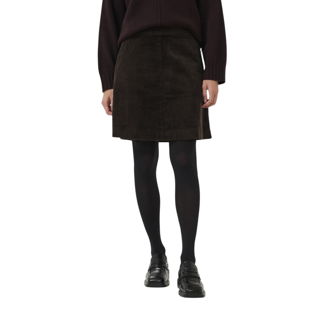 Modellen er 174 cm høj og bærer en størrelse 36. Denne korte nederdel i blød fløjl kombinerer komfort med tidløs elegance.