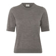 Modellen er 174 cm høj og bærer en størrelse M. Denne elegante kortærmede strik er fremstillet af 100% blød og varm uld, der føles behagelig mod huden. Den klassiske rundhalsede udskæring og de fine ribkanter ved ærmer og kant giver et tidløst udtryk, som gør strikken til en alsidig favorit i garderoben. Den rene, enkle silhuet gør den let at style – perfekt både alene til et afslappet look eller som et sofistikeret lag under en blazer til mere formelle anledninger.