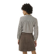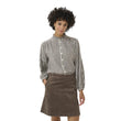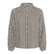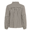 Denne ternede skjorte har et klassisk sort-hvidt gingham-mønster, der giver et tidløst og afslappet udtryk. Den har en høj krave med fine flæsedetaljer, der tilfører et feminint touch, samt gennemgående knaplukning foran.