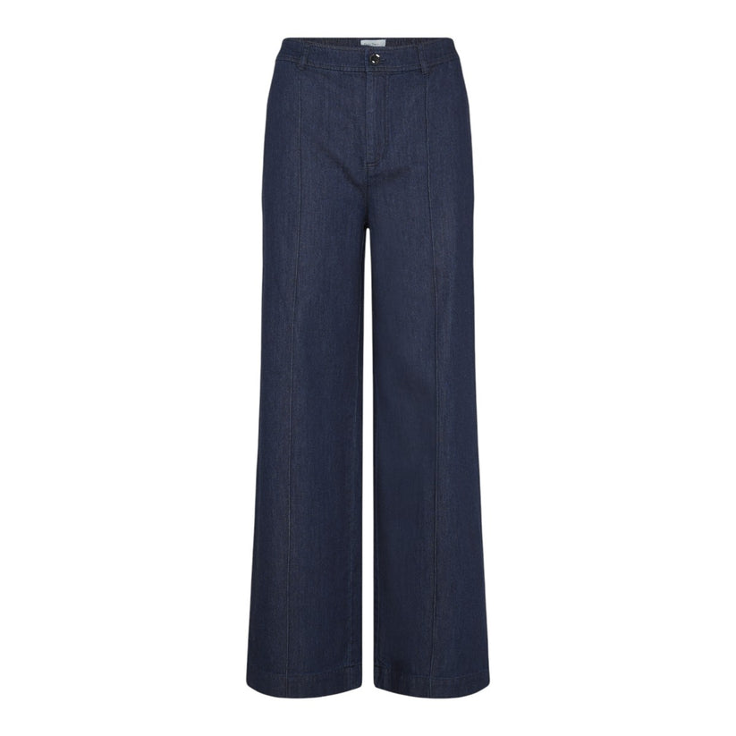 Modellen er 175 cm høj og bærer en størrelse 36. Disse denim-bukser i farven Rinse Blue Denim kombinerer klassisk komfort med et elegant udtryk. Det løse, lige ben skaber en afslappet silhuet, mens pressefolderne tilfører et sofistikeret touch.