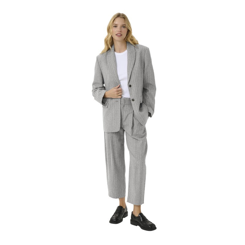 Tilføj et sofistikeret touch til din garderobe med denne grå pinstripe blazer. Den klassiske pasform kombineret med diskrete lodrette striber giver et tidløst og stilrent look, som fungerer både til arbejde og festlige lejligheder.