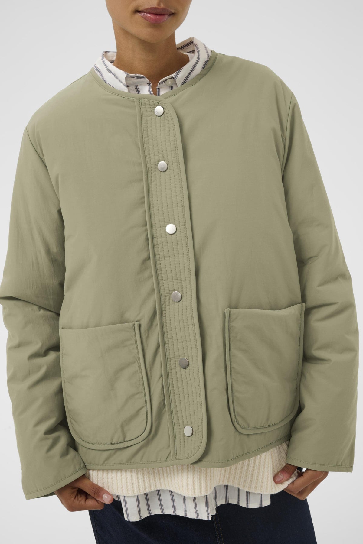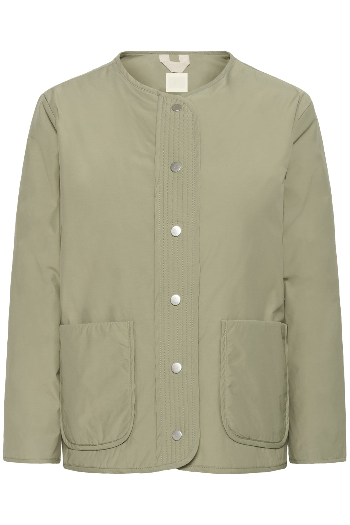 En let og funktionel jakke med et minimalistisk udtryk, der passer perfekt til en afslappet og moderne garderobe. Det rene design uden krave giver jakken et enkelt look, mens trykknaplukningen foran understreger den praktiske og tidløse stil. Farven er afdæmpet og nem at kombinere med både lyse og mørke nuancer.