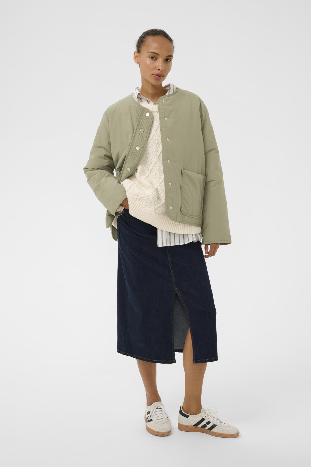 Jakken egner sig særligt godt som overgangsjakke og fungerer fint både indendørs som et ekstra lag og udendørs på mildere dage. De store påsyede lommer giver et casual præg og gør jakken anvendelig i hverdagen, uanset om den styles med jeans, bukser eller over en kjole.