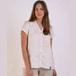 Skjorten er lavet af 100 % blødt hørstof med en let tekstur. Denne skjorte har korte ærmer og V-udskæring.