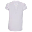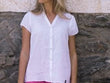 Skjorten har t-shirt ærmer, v-udskæring og lukkes med knapper foran.