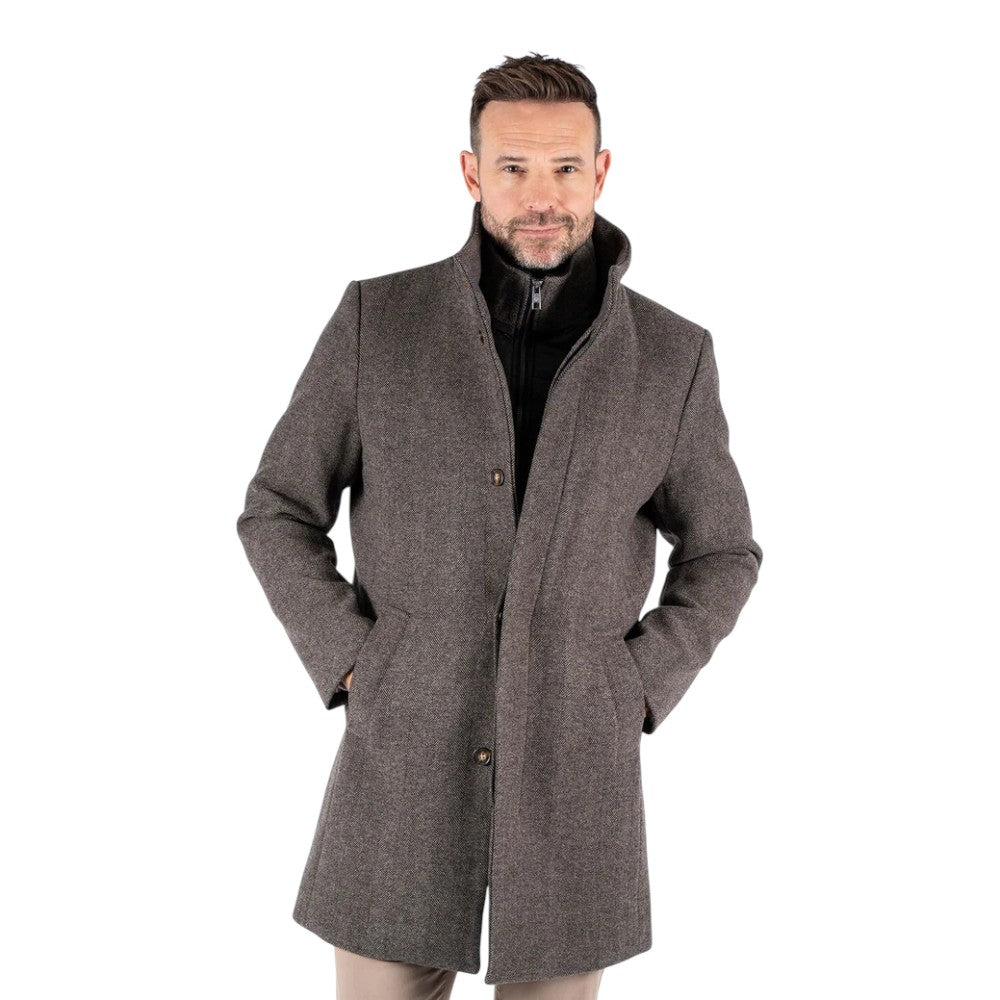 Denne elegante herrefrakke kombinerer klassisk design med moderne snit. Den er skåret i en struktureret uldblanding, som giver både varme og et sofistikeret udtryk.