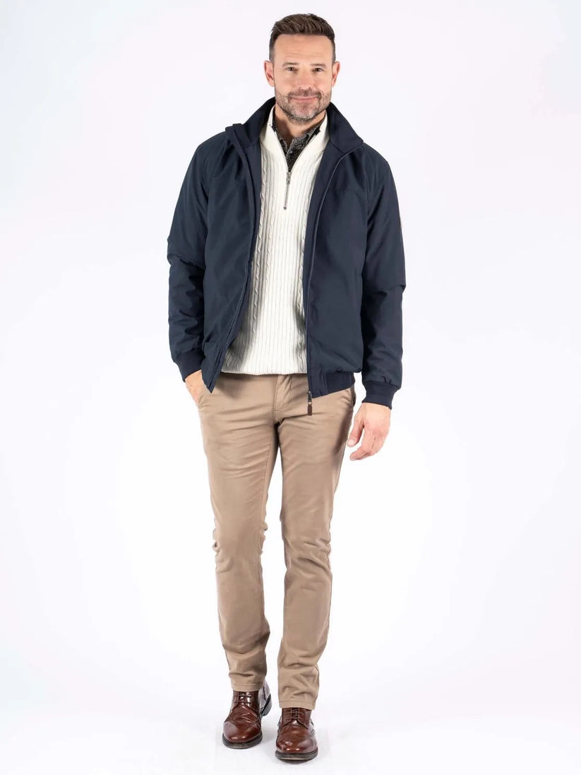 Denne jakke kombinerer et klassisk udtryk med moderne komfort. Den rene silhuet og den mørkeblå farve gør den nem at style til både hverdag og mere pæne anledninger. Den høje krave giver et stilrent look og ekstra beskyttelse på kølige dage.