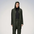 Den tidløse unisex-regnjakke har en lang, minimalistisk silhuet med funktionelle detaljer som hætte med skygge, skrå dobbeltsvejsede lommer med klap, justerbare manchetter og trekantet slids bagpå.