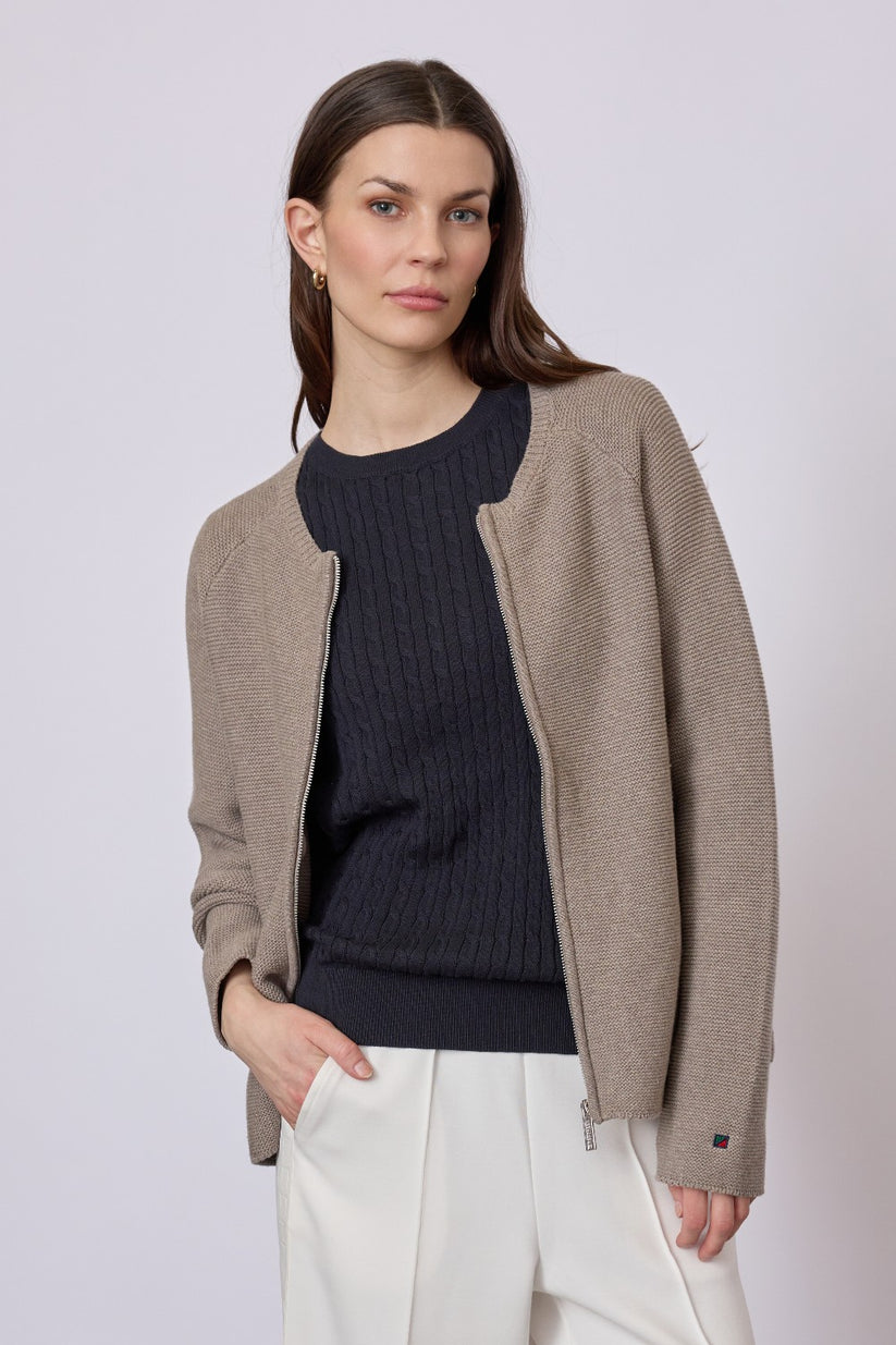 Denne strikkede cardigan kombinerer et klassisk udtryk med rene, maritime referencer. Raglanærmerne giver et afslappet og naturligt fald over skuldrene, mens lynlåsen med Redgreen-logo på pulleren tilfører en diskret branded detalje.