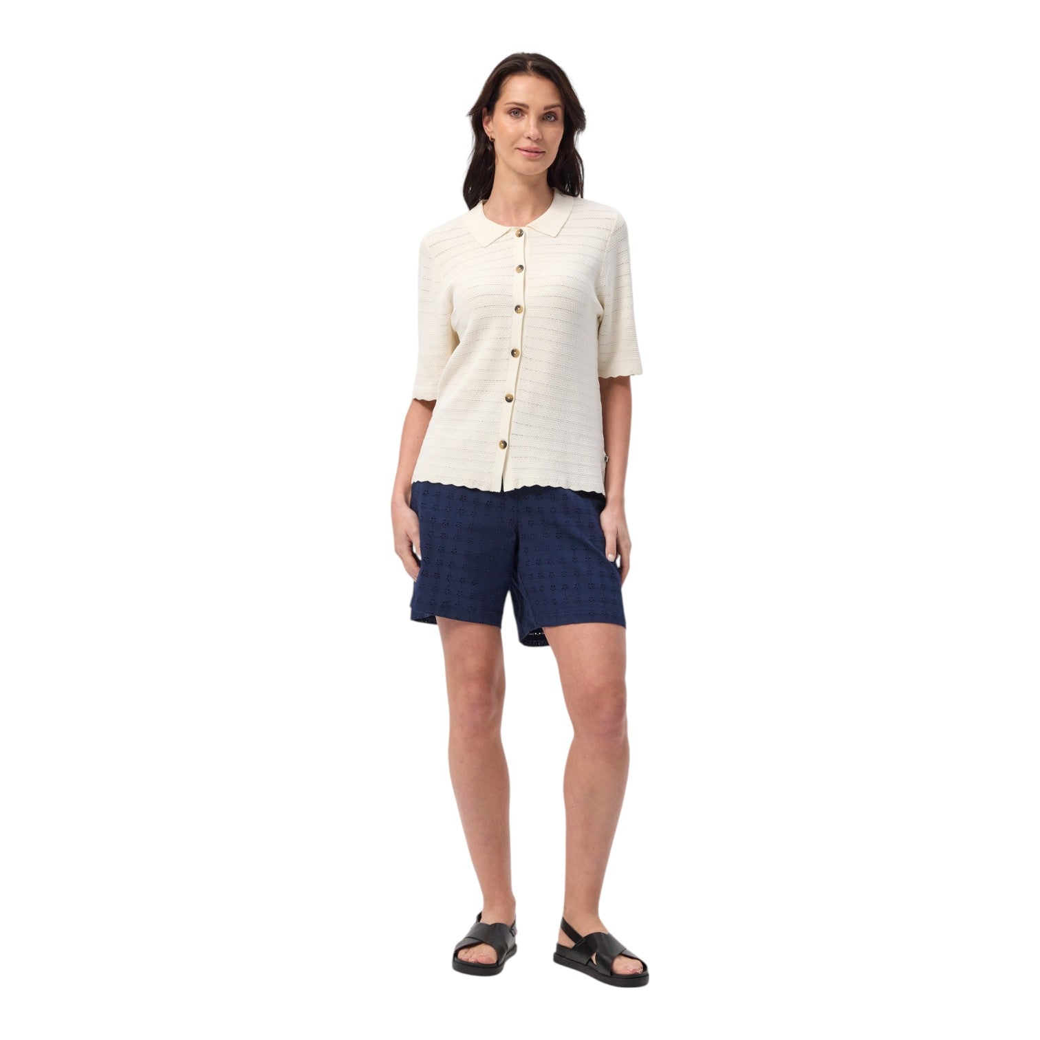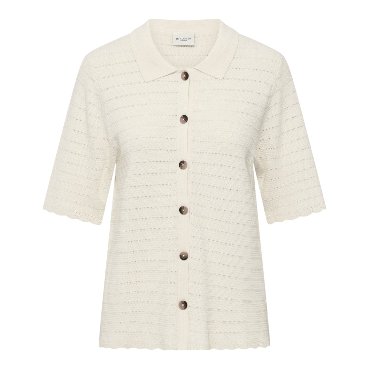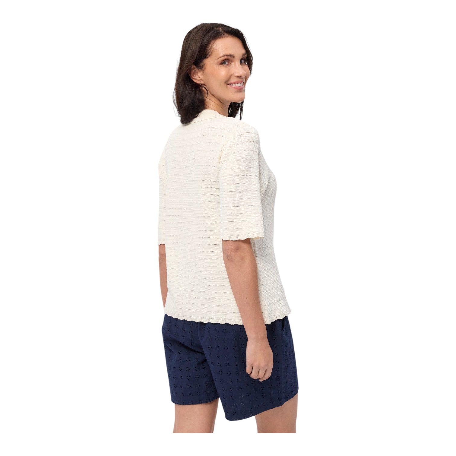 Strikket top med korte ærmer og knapper ned langs fronten. Den har smukke kammuslingekanter for enden af ærmerne og forneden.