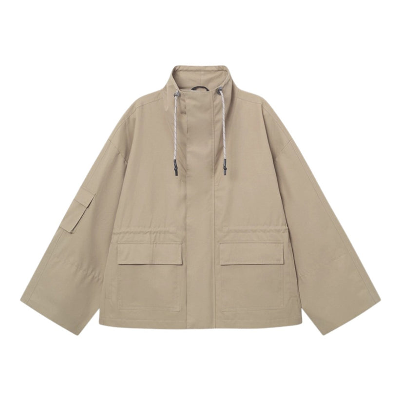 - Detaljer: Høj firskåren krave med justerbare snore for vindbeskyttelse og brede ærmer med vindmanchetter.