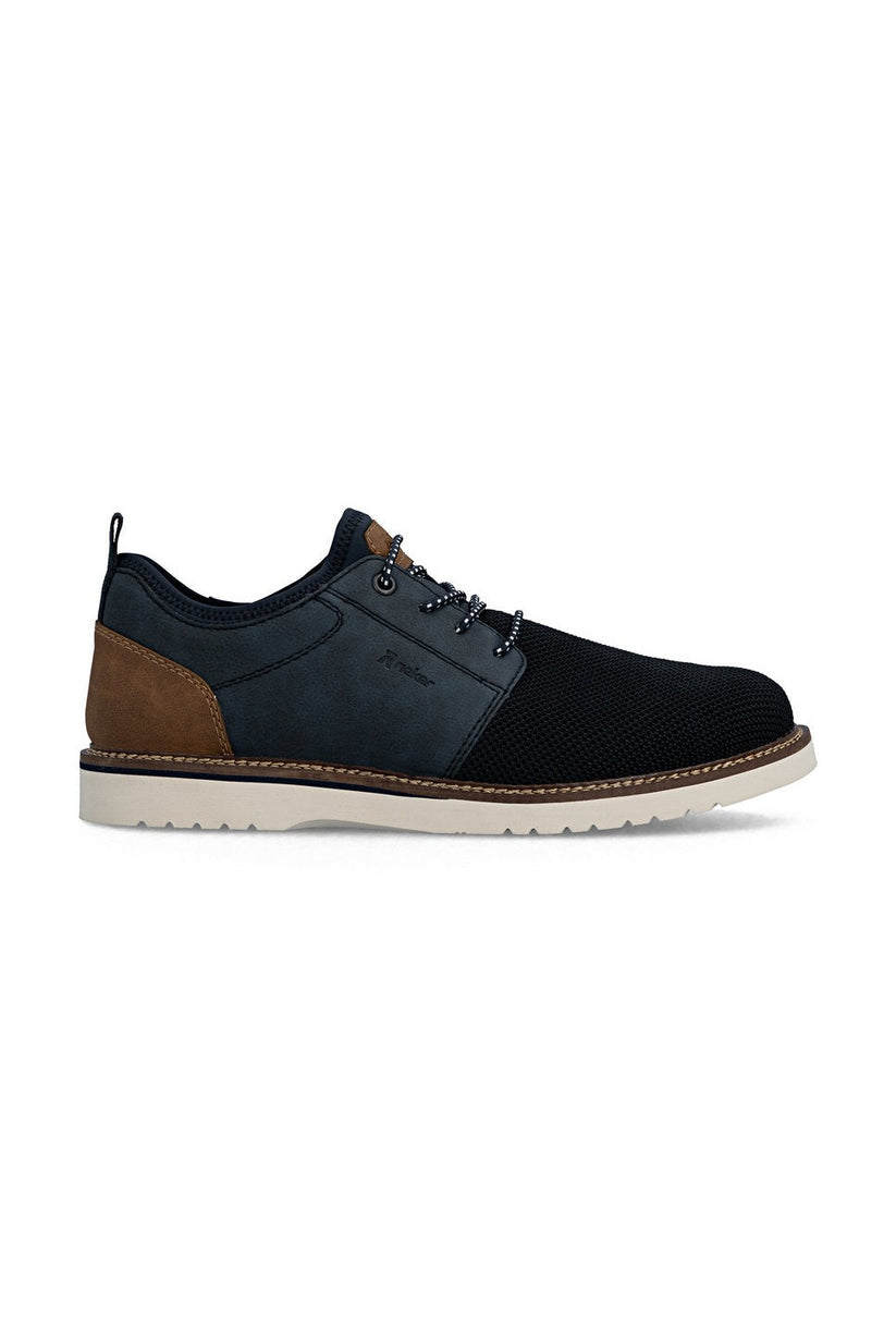 Rieker herresko i en flot blå nuance med brune kontrastdetaljer, der giver et moderne og stilrent udtryk. Den åndbare mesh-front sikrer god ventilation, mens den glatte overdel og hælkappen i brun skaber et eksklusivt look. Snørelukningen giver en god og justerbar pasform.