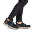 Denne sporty Rieker sneaker kombinerer komfort og moderne design i én og samme sko. Overdelen er lavet i en kombination af slidstærkt tekstil og syntetisk materiale, som sikrer god åndbarhed og fleksibilitet. De brune detaljer skaber en flot kontrast til den mørkeblå overdel og giver skoen et casual, men stilfuldt look.