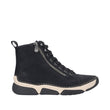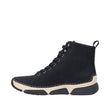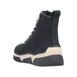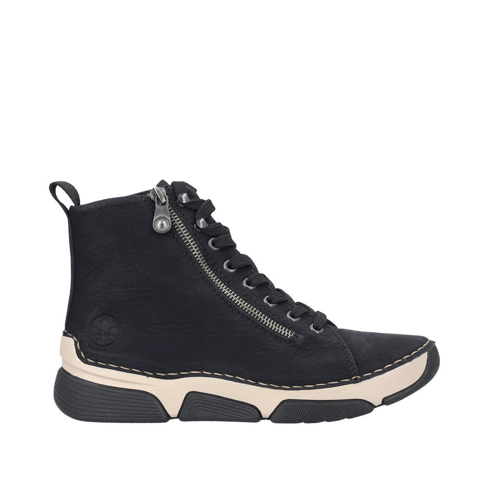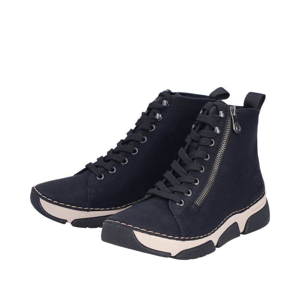 Støvlen er udstyret med snørebånd og en praktisk lynlås, som gør den nem at tage af og på. Indvendigt giver den lette foring og den bløde indersål en behagelig pasform hele dagen. Takket være Rieker Antistress-teknologien føles støvlen ekstra let og fleksibel, mens den mønstrede ydersål sikrer god stødabsorbering og skridsikkerhed – selv på glatte underlag.