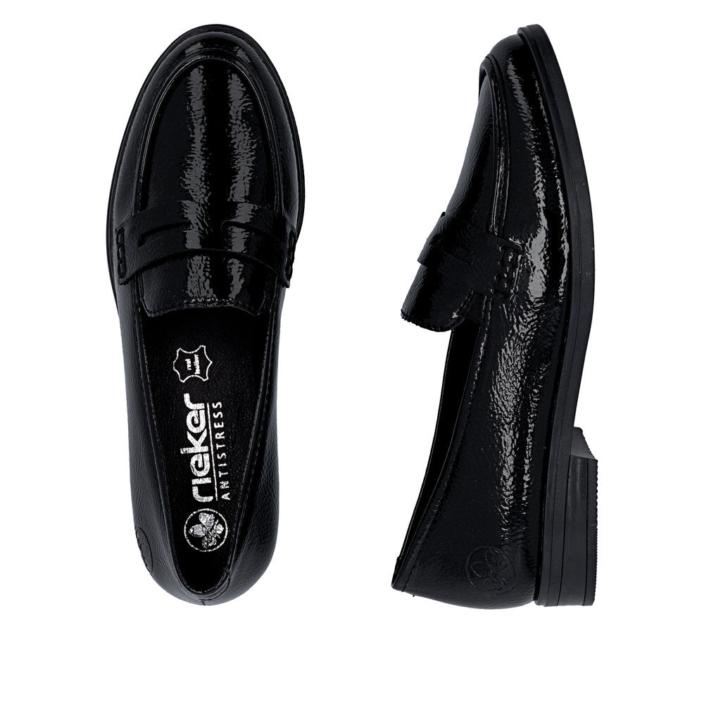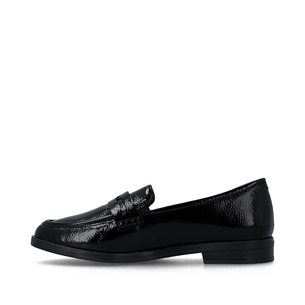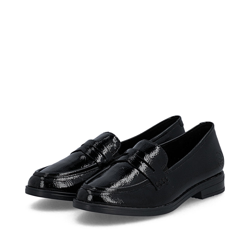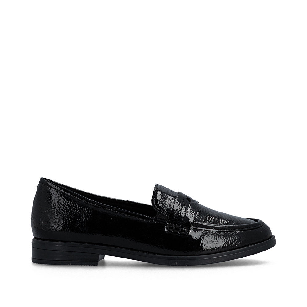 Rieker loafers til dame i sort lak er et elegant valg, der kombinerer klassisk design med et moderne og iøjnefaldende udtryk. Den blanke lakoverdel giver skoen et eksklusivt look, som gør den velegnet både til hverdag og mere festlige anledninger, hvor outfittet gerne må skille sig lidt ud.