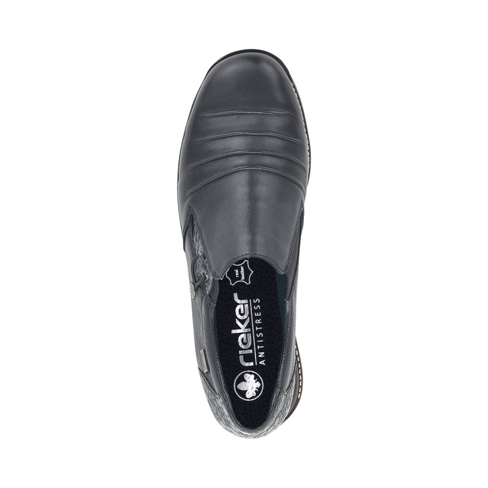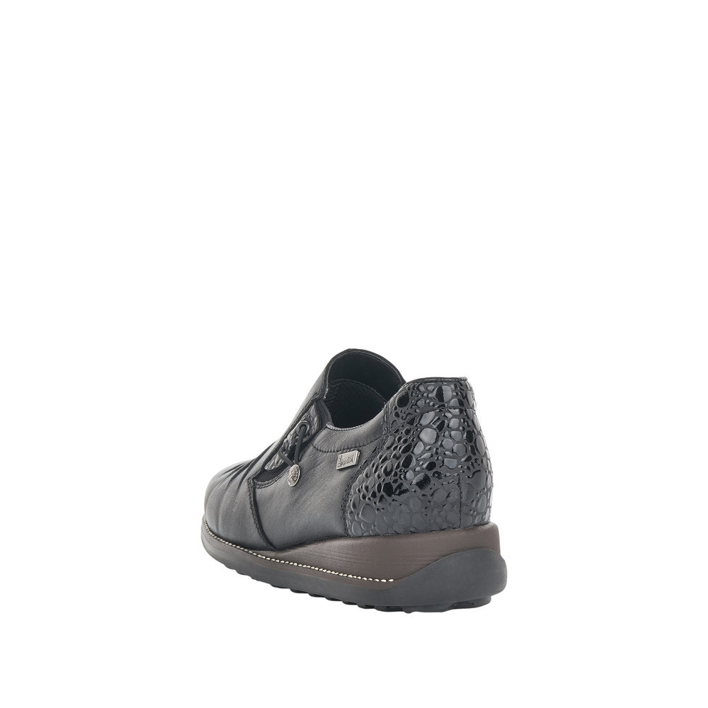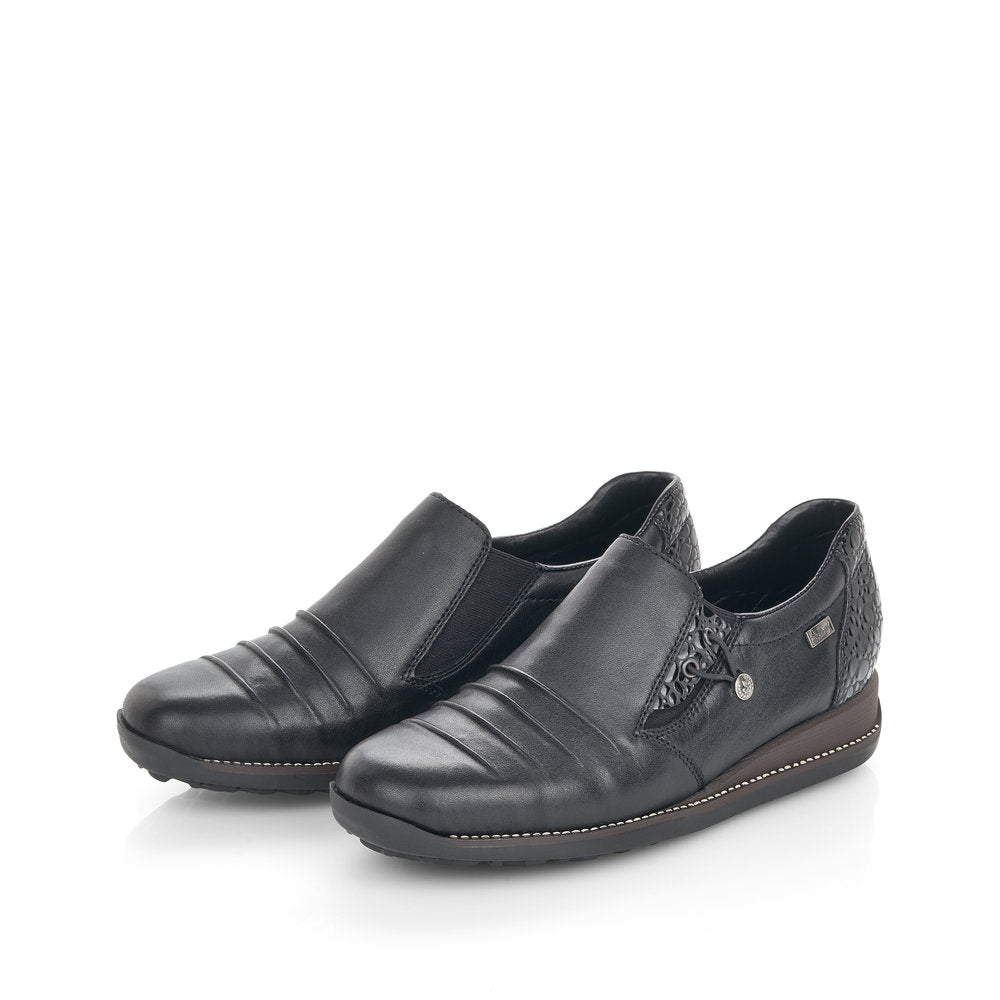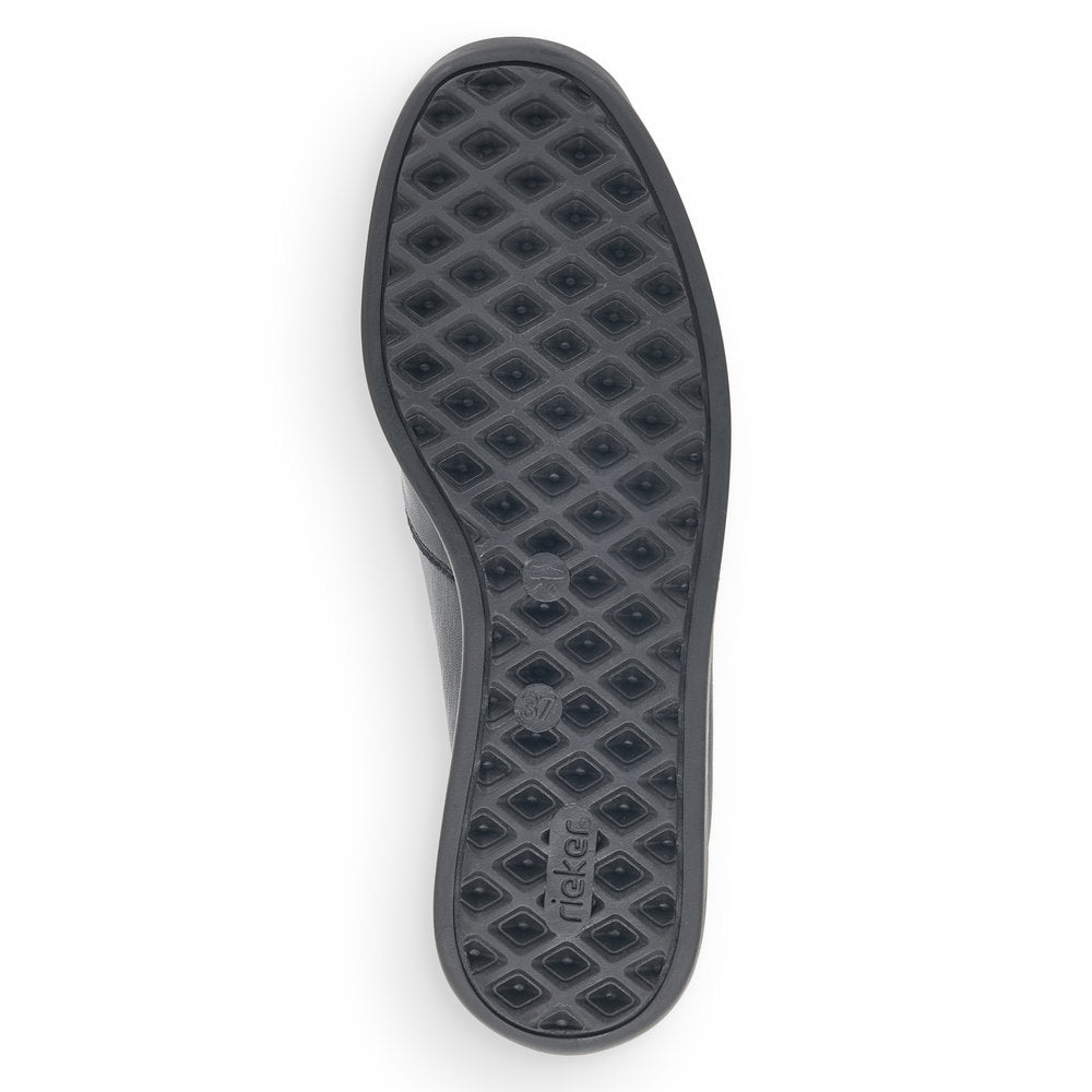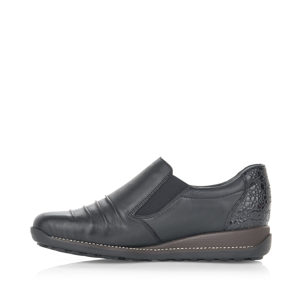 Denne praktiske og stilfulde slip-on sko fra Rieker er skabt til dig, der ønsker komfort og funktion i hverdagen. Det sorte læderlook kombineret med detaljeret mønster ved hælen og elastiske indsatser giver både visuel appel og nem adgang.