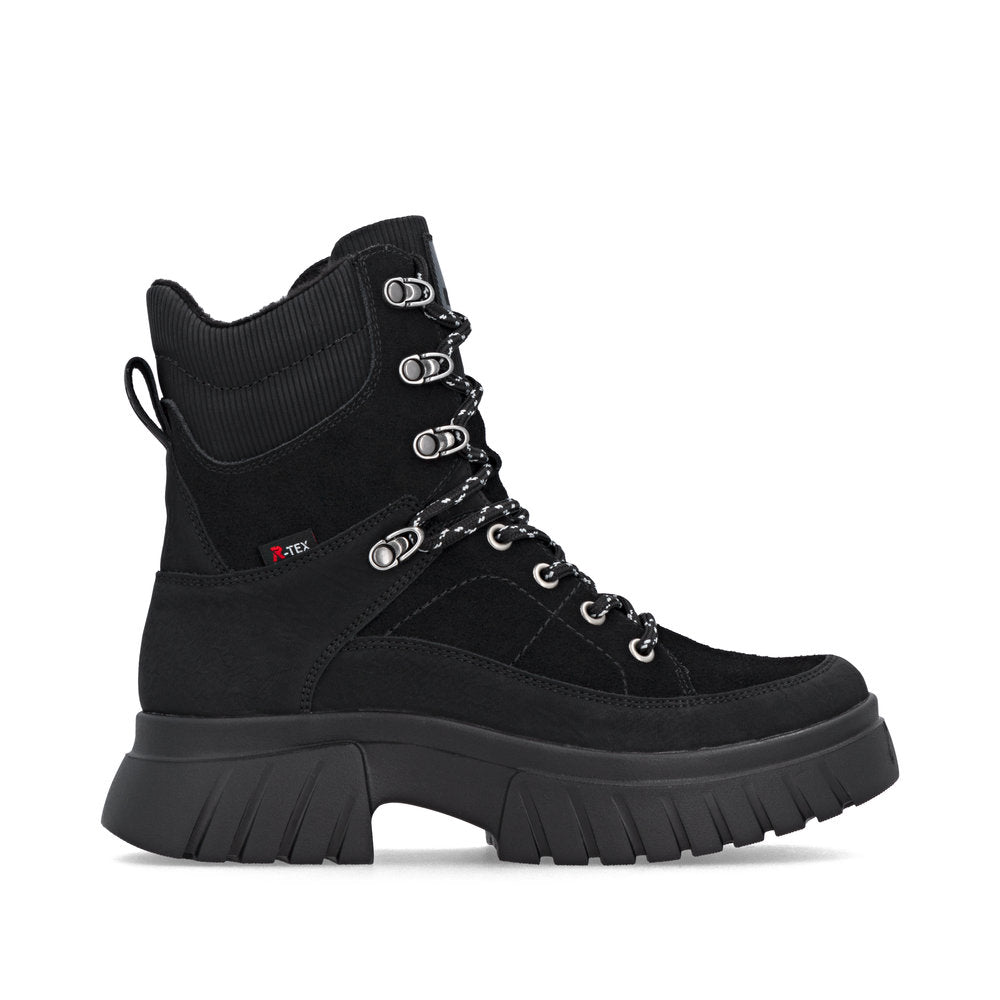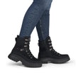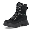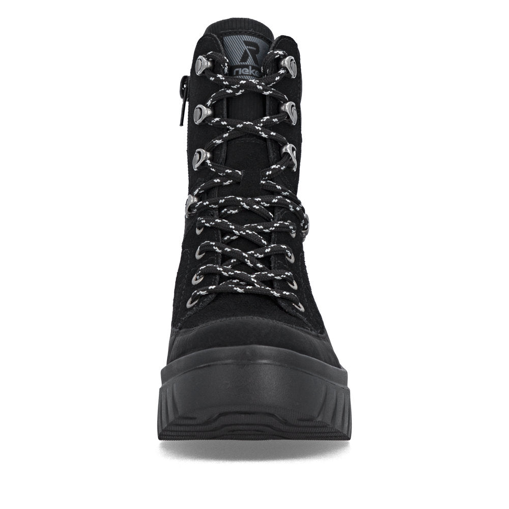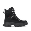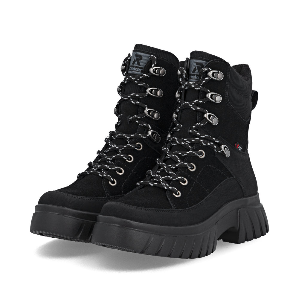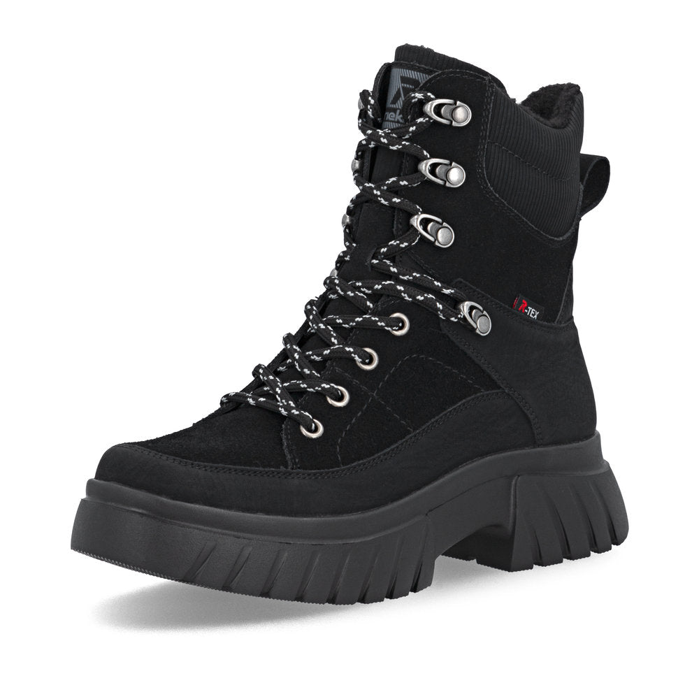 Denne sorte Rieker støvle kombinerer et råt outdoor-look med den komfort, Rieker er kendt for. Støvlen har et højt skaft med snørelukning og praktiske metaløjer, der giver et sporty og robust udtryk. Den er udstyret med RiekerTex-membran, som gør den stærkt vandafvisende, så dine fødder forbliver tørre selv i vådt vejr.