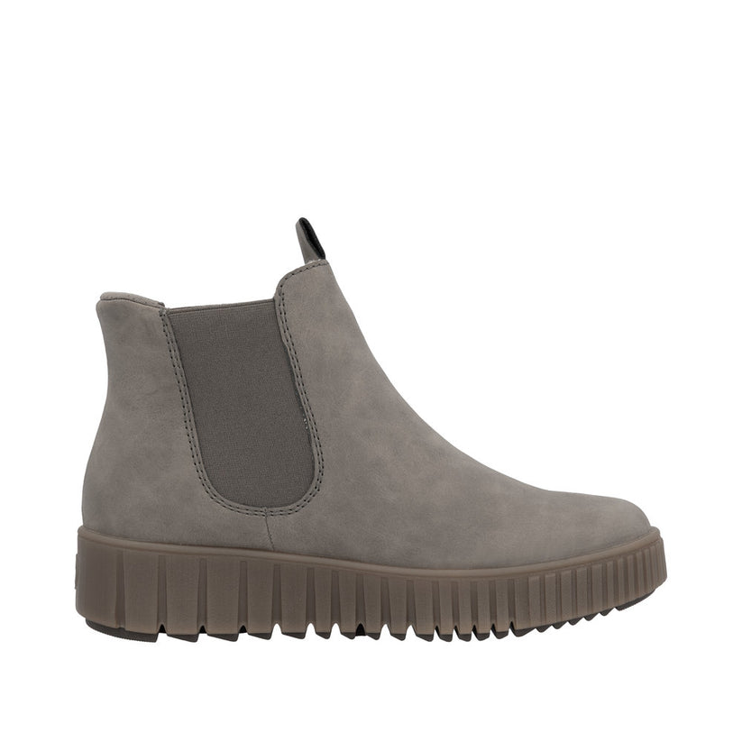 Denne stilfulde grå støvle fra Rieker forener moderne design og praktisk funktionalitet. Med Ready 2 Go-teknologien og en fast hælkappe kan du nemt træde i støvlen uden at bruge hænder – ideel til hverdagen, hvor det skal gå hurtigt.