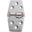 Rustfri hængsel med indbygget friktions dæmpning. Som betyder at de går lidt trægt, hvilket kan være en fordel da de låser åbningen evt. på midten når du åbner en luge. Det betyder også at lugen ikke klapper ned utilsigtet.