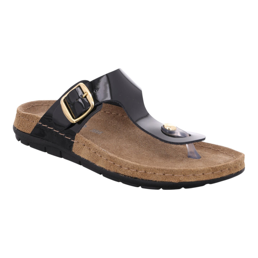 En moderne og stilren sandal fra Rohde, der kombinerer komfort med et elegant udtryk. Sandalen har en bred rem i sort lak med en flot guldspænde og en praktisk tåsplit, der giver en god pasform og støtte til foden. Den bløde fodseng i ruskind sikrer høj komfort dagen lang, og sålen er fleksibel og skridsikker – ideel til både by og strand.